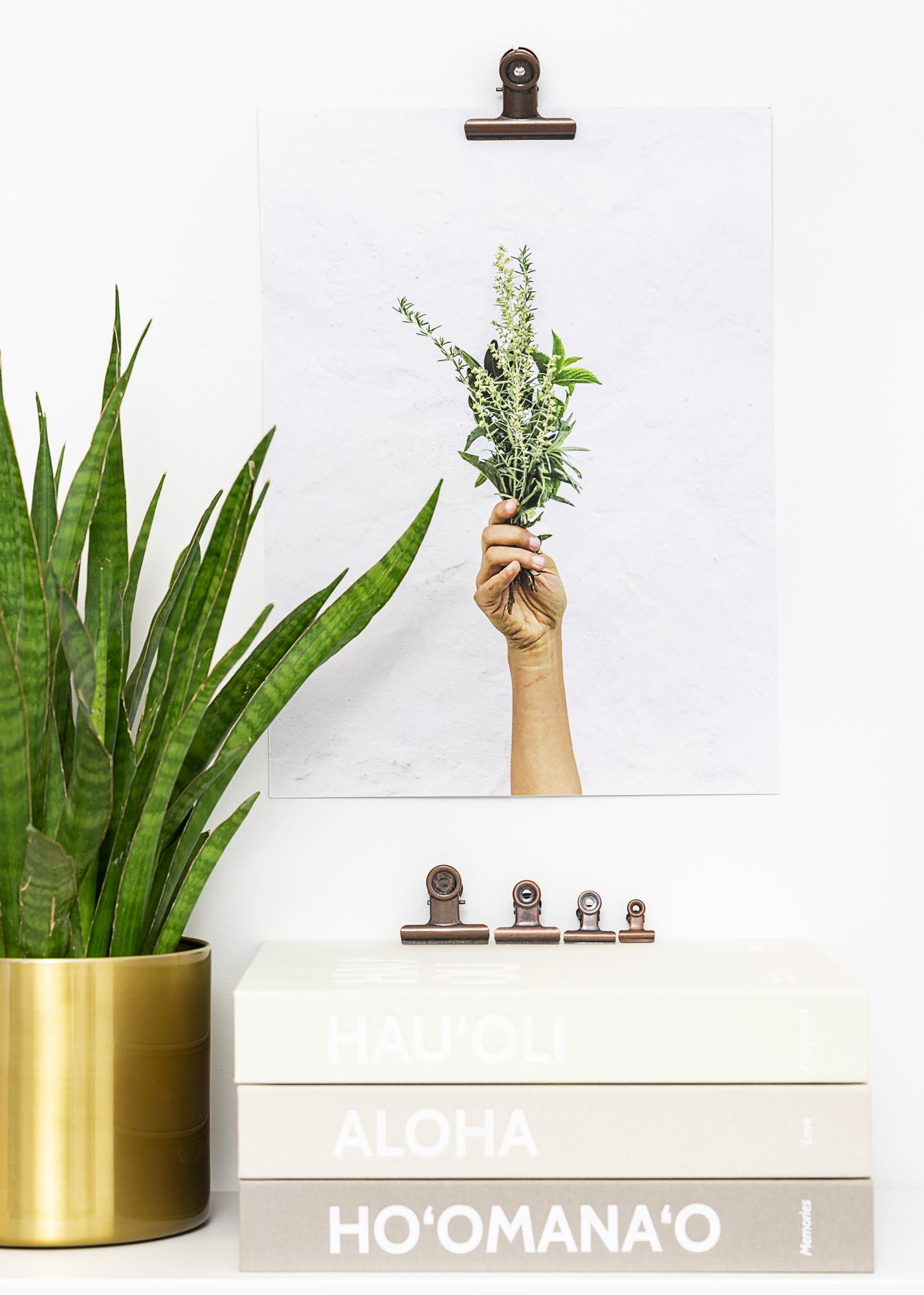 Toto je kovová svorka v rustikálnom štýle s krásne opotrebovanou mosadzou, ktorá vám poskytne trendové zavesenie plagátov alebo výtlačkov. Montáž na stenu je tiež veľmi jednoduchá vďaka otvorom v elegantnej okrúhlej hore svorky na plagáty. Otváranie svorky poskytuje flexibilné, ale silné uchopenie, ktoré vám umožní namontovať tenké papiere aj plagáty s trochou väčšou hrúbkou, a ak chcete zavesiť veľký plagát, môžete vždy použiť dve kovové svorky.