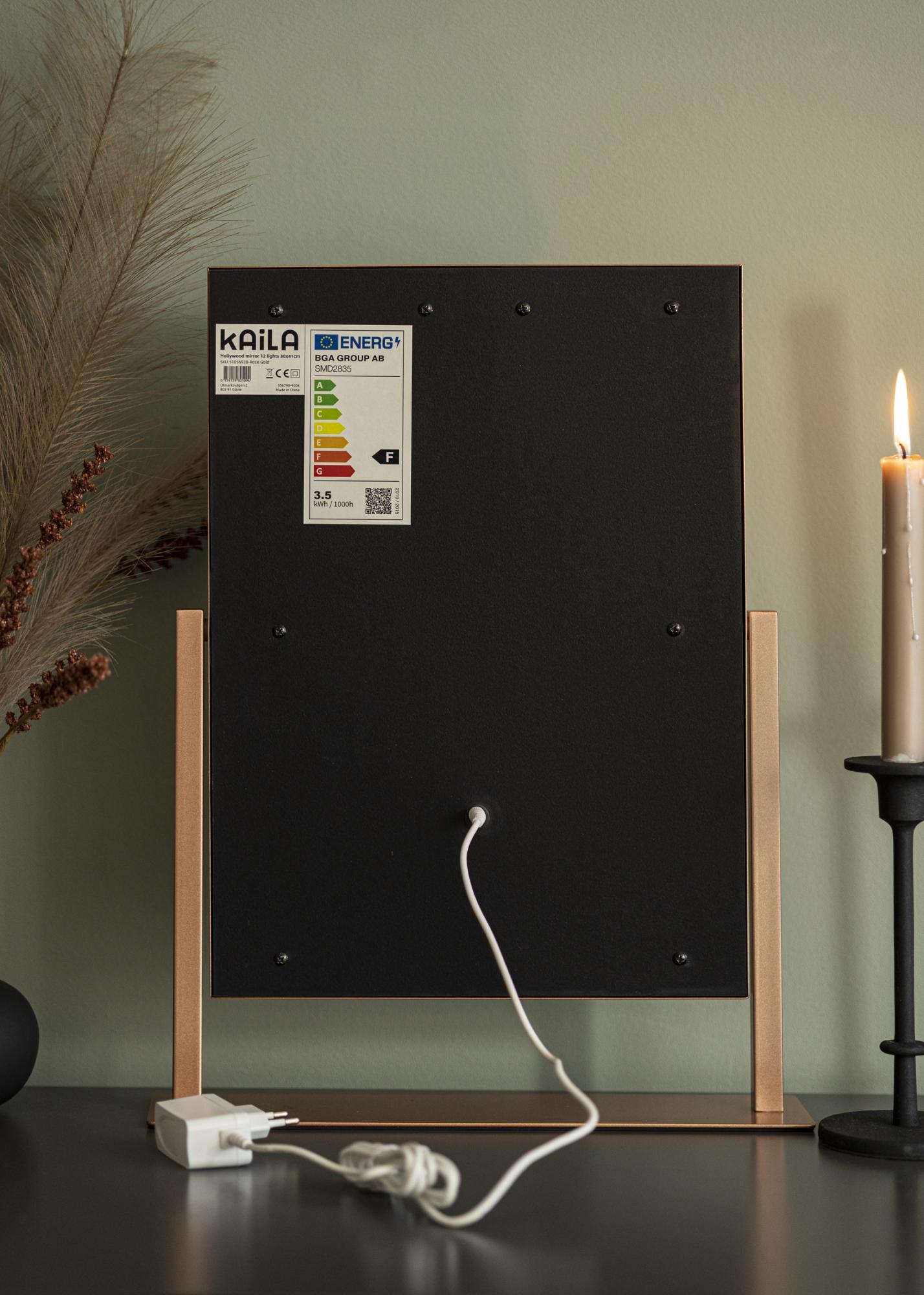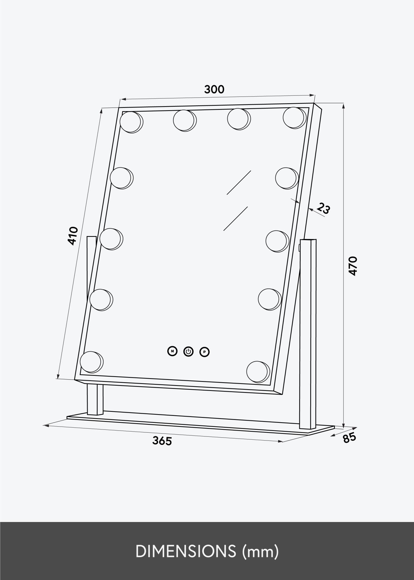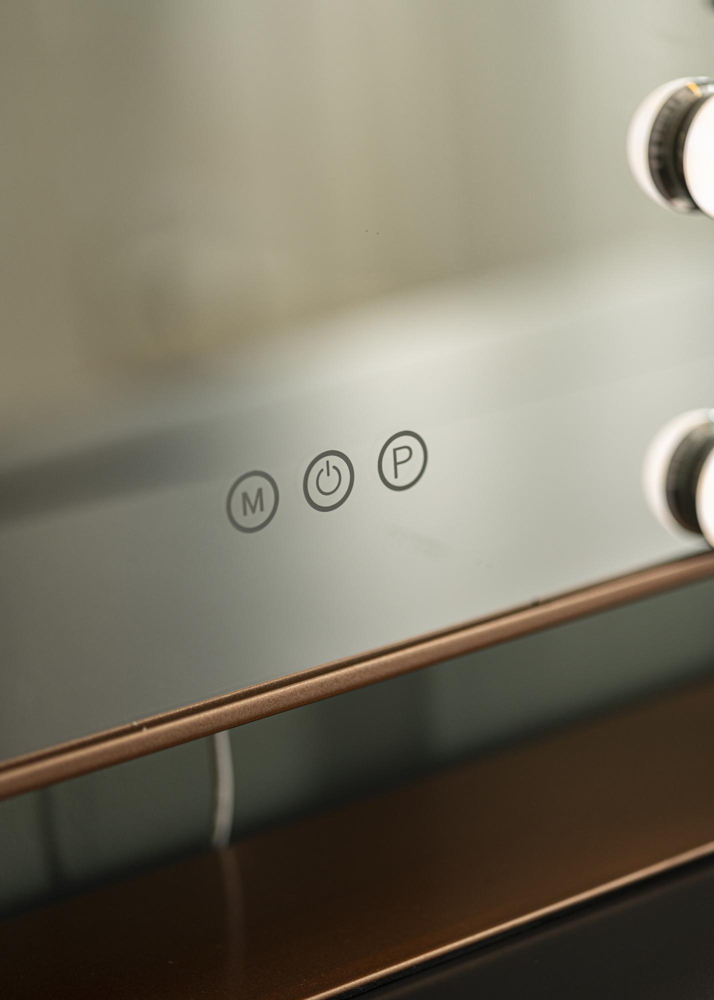 Toto zrkadlo má LED-osvetlenie, v podobe 12 väčších lámp, ktoré krásne obklopujú zrkadlovú plochu. Rozsvietite zrkadlo jedným z dotykových tlačidiel na prednej strane zrkadla. Sú tam tiež dotykové tlačidlá na nastavenie jasu a farebnej teploty. Tlačidlo označené písmenom „M“ nastavuje farebnú teplotu a tlačidlo označené písmenom „P“ nastavuje jas. Elektrické pripojenie zrkadla prebieha pomocou zástrčky.