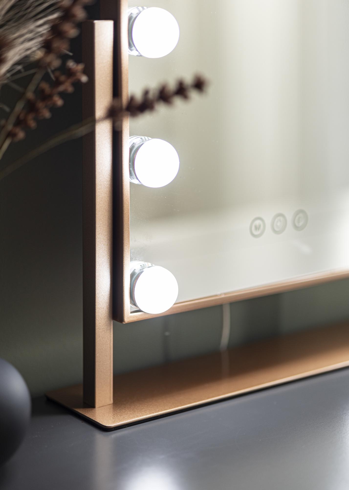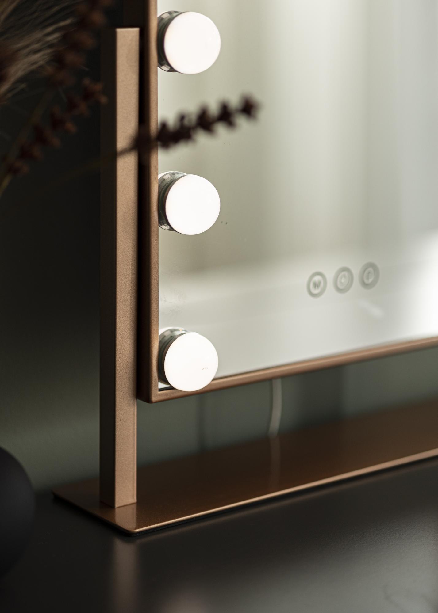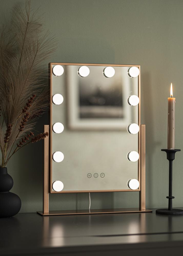Toto je elegantnejšie kozmetické zrkadlo s 30x41 cm veľkou zrkadlovou plochou, integrovaným osvetlením a elegantným odtieňom ružového zlata. Zrkadlo má štýlový stojan, čo umožňuje jeho jednoduché umiestnenie na kozmetický stolík, skrinku alebo bočný stolík. Pre jednoduchšie použitie môžete zrkadlo nakláňať pri aplikácii make-upu.