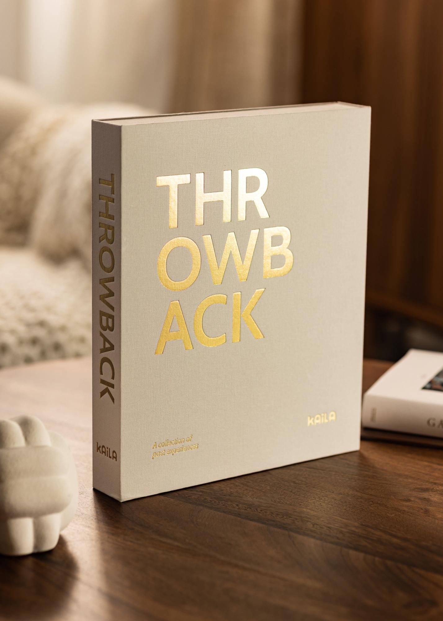 Toto je veľmi trendový fotoalbum luxusne zabalený ako štýlová Coffee Table Book – takzvaný Coffee Table Photo Album. Fotoalbum je navrhnutý ako exkluzívna krabica, ktorú otvoríte, aby ste získali prístup k obsahu. Obal je elegantne potiahnutý krémovou textíliou a na prednej strane a chrbte albumu zdobí zlatý nápis „THROWBACK“. Tento známy pojem pre spomienku dodáva fotoalbumu moderný a trochu odvážny pocit, keďže sa naozaj odlišuje od klasických štýlov albumov. Album má tiež podtitul „A collection of past experiences“ vytlačený v ľavom dolnom rohu.