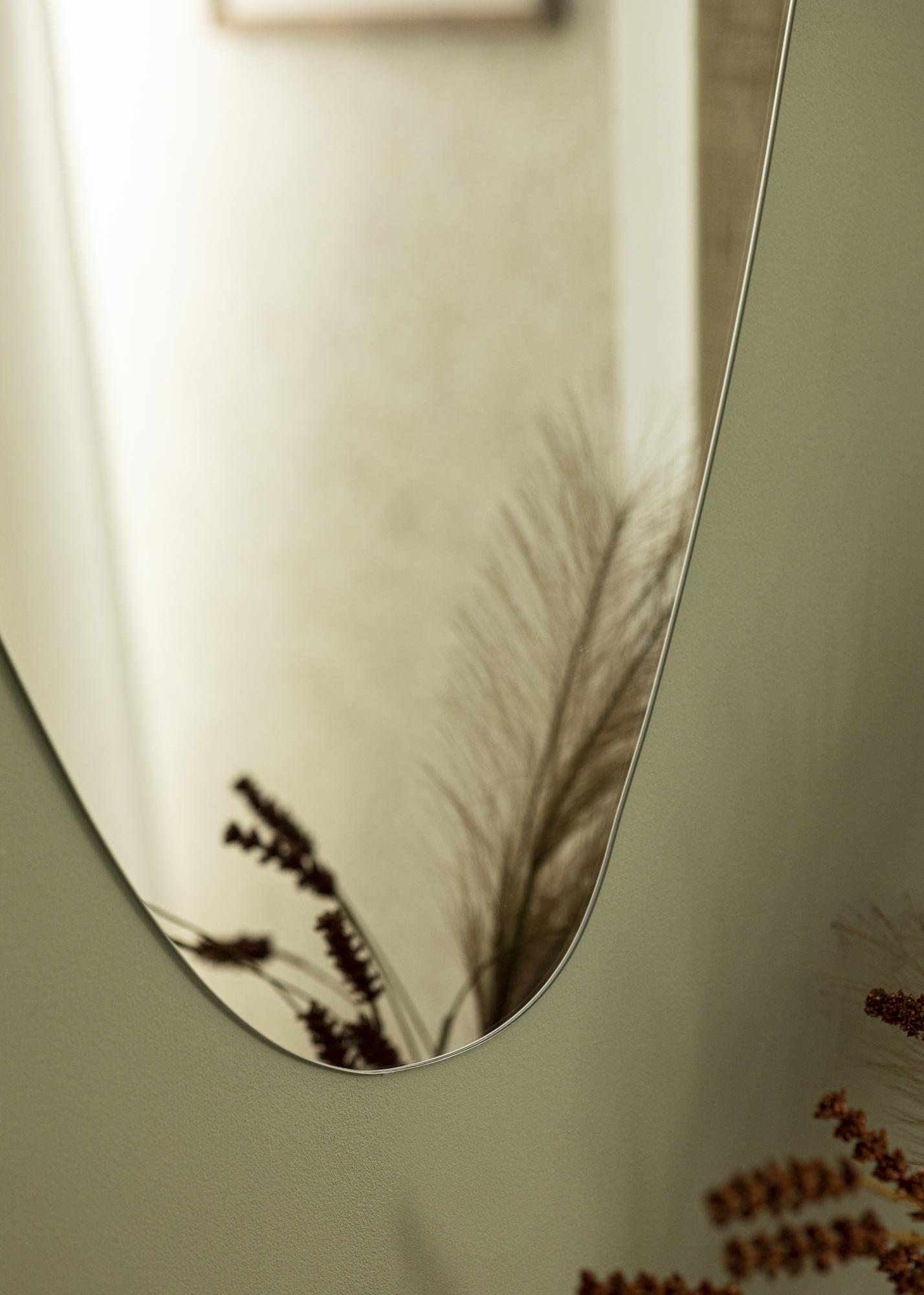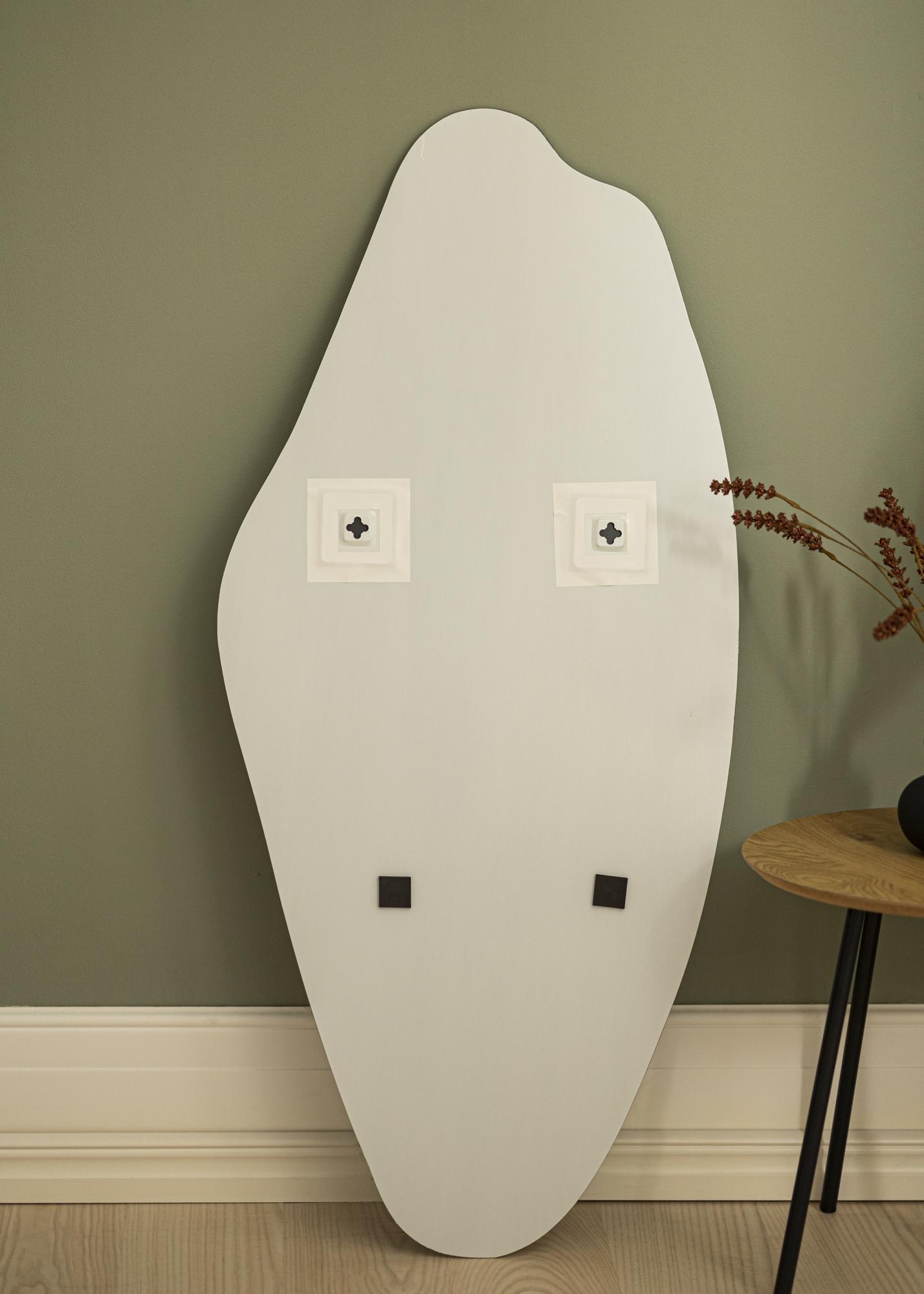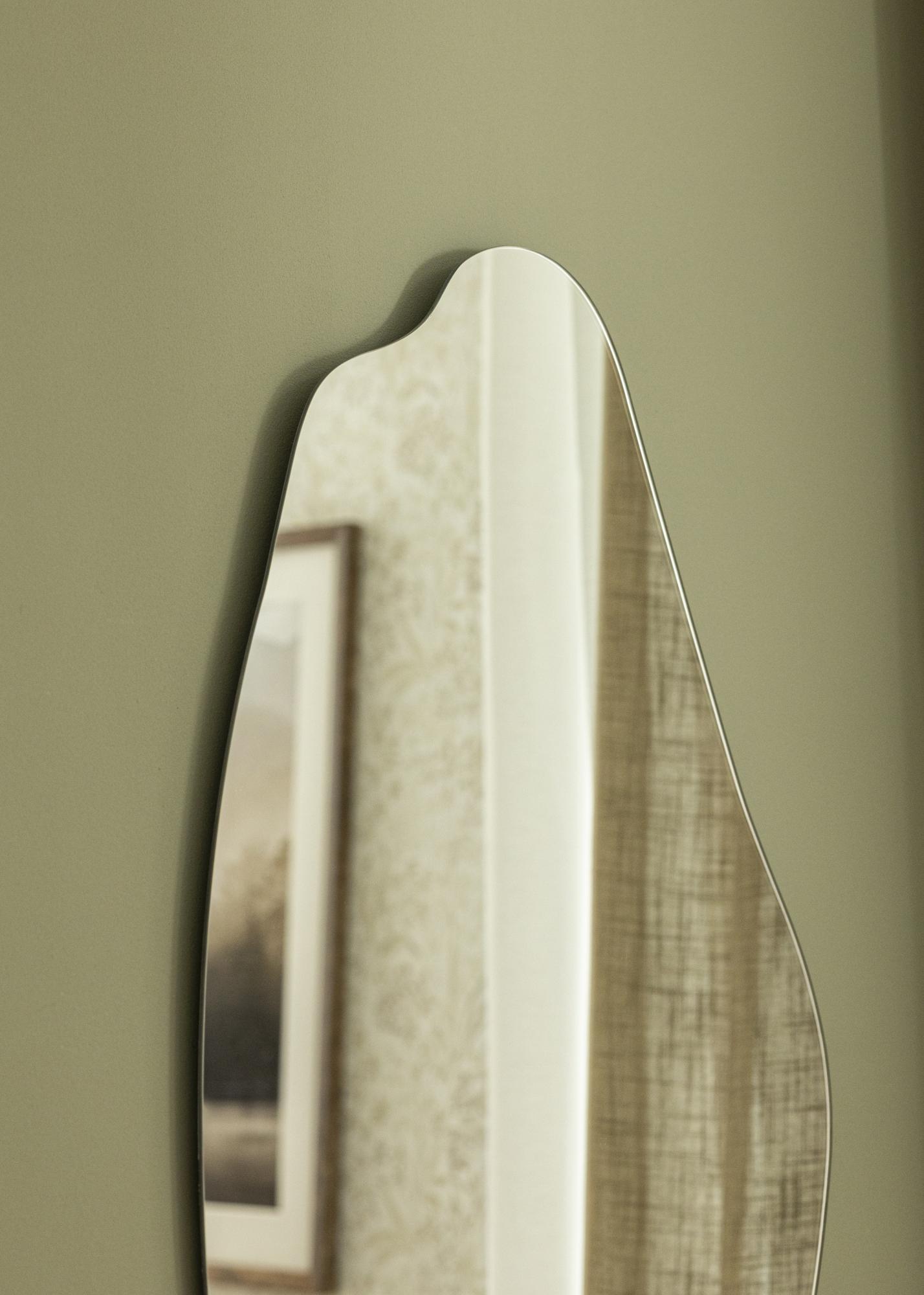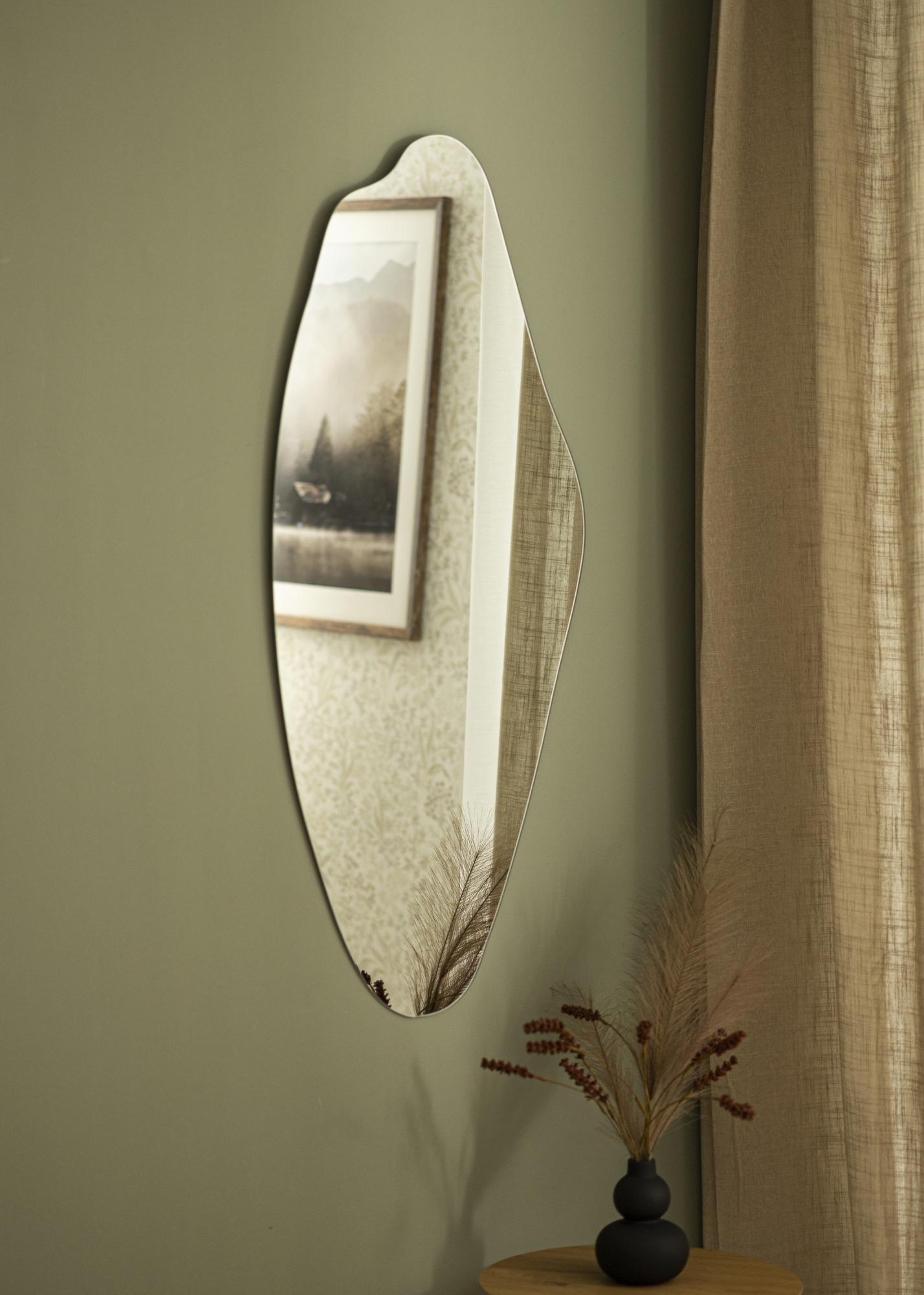 Toto je podlhovasté zrkadlo s krásnym asymetrickým tvarom, čo z neho robí vzrušujúci interiérový doplnok, ktorý sa perfektne hodí do moderného domova. Zrkadlo má praktické nástenné držiaky na zadnej strane a zavesí sa na stenu v miestnosti, ktorú si vyberiete – je vhodné dokonca aj na použitie v kúpeľni!