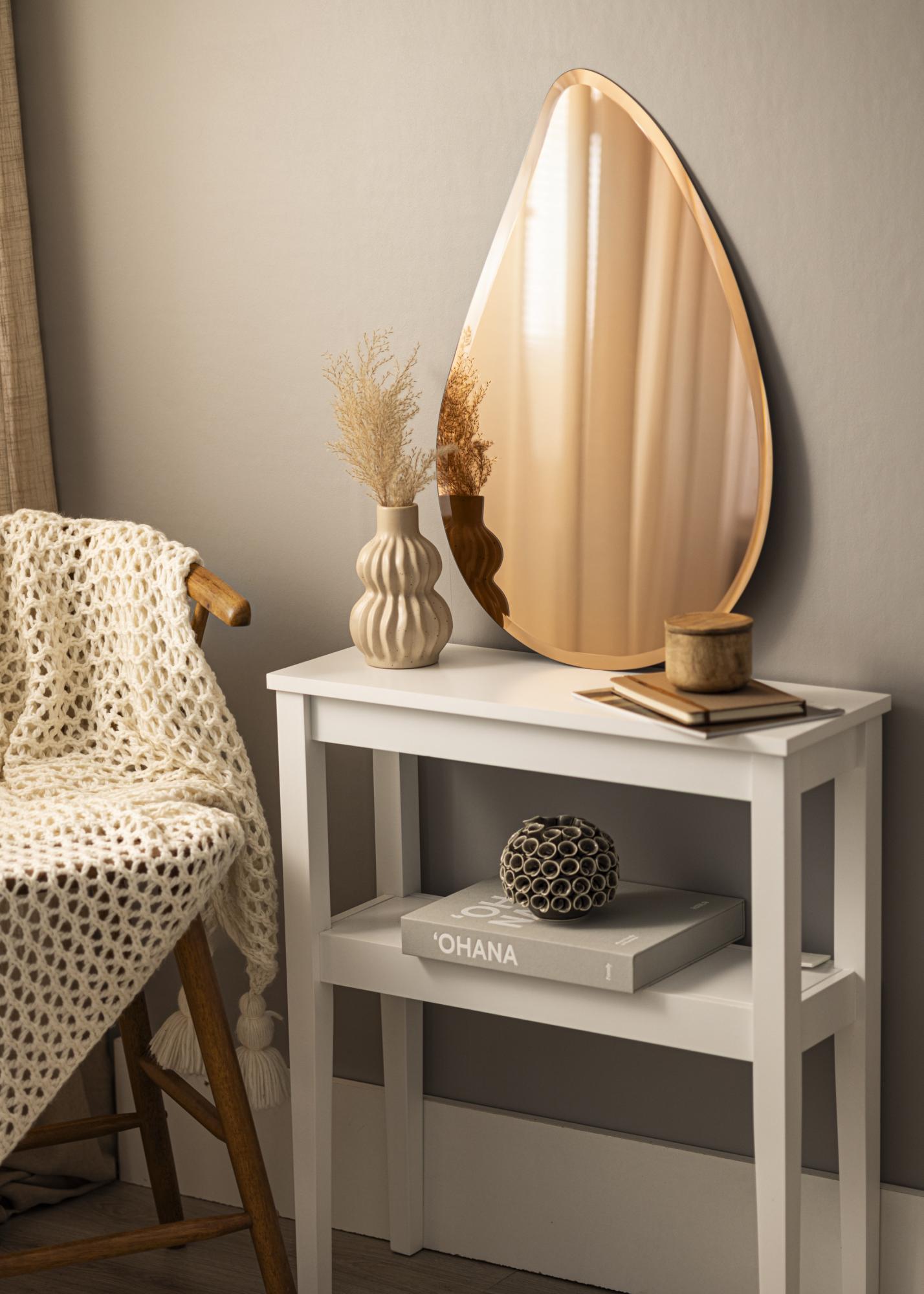 Tento nádherný zrkadlo má tvar kvapky, čo mu dodáva jemný a elegantný vzhľad. Zrkadlo je navyše vybavené fazetovanou hranou – čo ešte viac posilňuje exkluzívny pocit. Ale čo možno najviac robí toto zrkadlo skutočne trendovým interiérovým doplnkom, je efektné a moderné zrkadlové sklo s tóny ružového zlata!