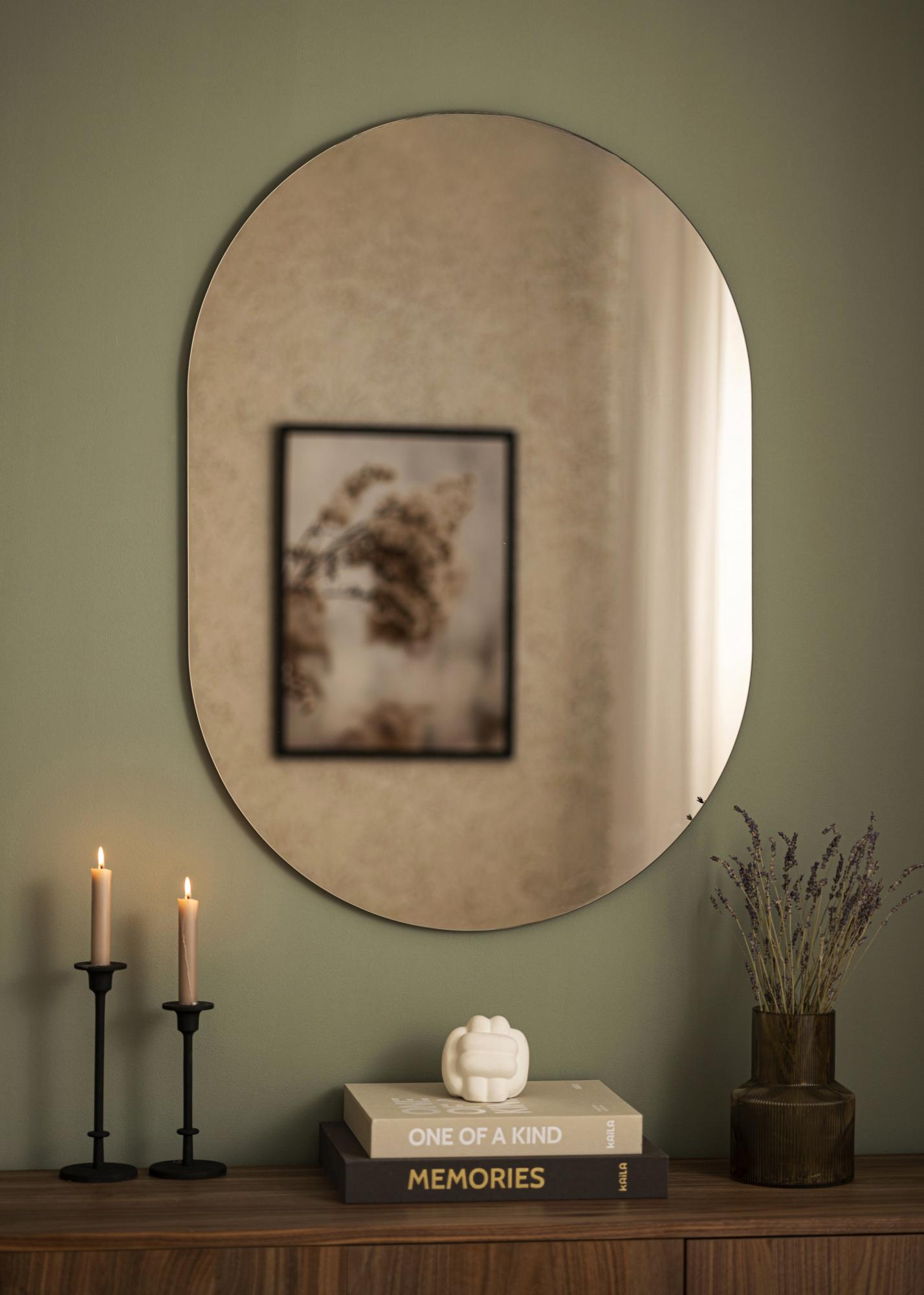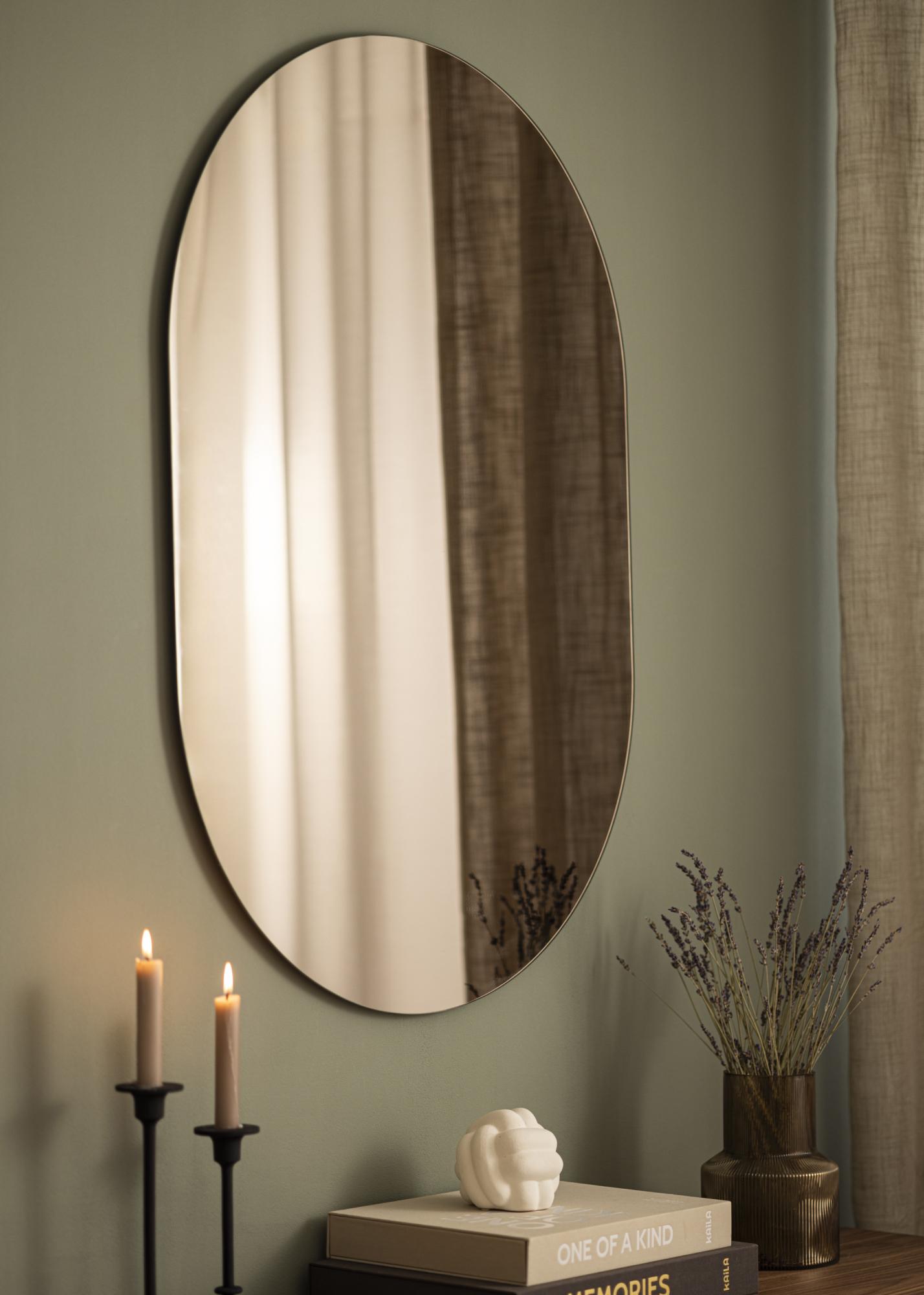 Oválne zrkadlo prináša jemný a elegantný dojem do vášho domova. Práve toto oválne zrkadlo má navyše zrkadlové sklo tónované v štýlovej odtieni tmavého bronzu. Tento efektívny a trendový detail je kombinovaný s elegantným dizajnom, keďže zrkadlo je veľmi tenké a nie je vybavené žiadnym rámom. Výsledkom je pútavý, moderný a elegantný interiérový prvok, ktorý možno umiestniť do akejkoľvek miestnosti, kde chcete pridať funkčnosť a trendový švédsky dizajn!