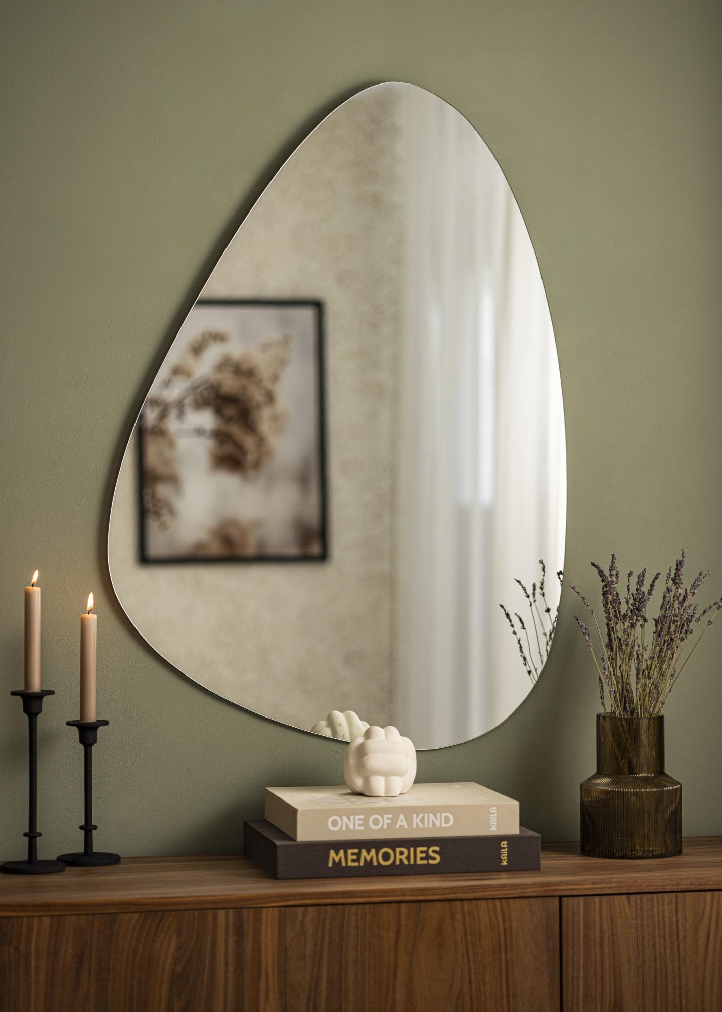 Táto zrkadlo má trendový a asymetrický tvar – takmer ako vajce. Jemný a elegantný tvar, ktorý vytvára príjemnú a pozývajúcu atmosféru v miestnosti, kde je umiestnené. Zrkadlo je navyše veľmi tenké, čo zdôrazňuje štýlový a elegantný vzhľad.