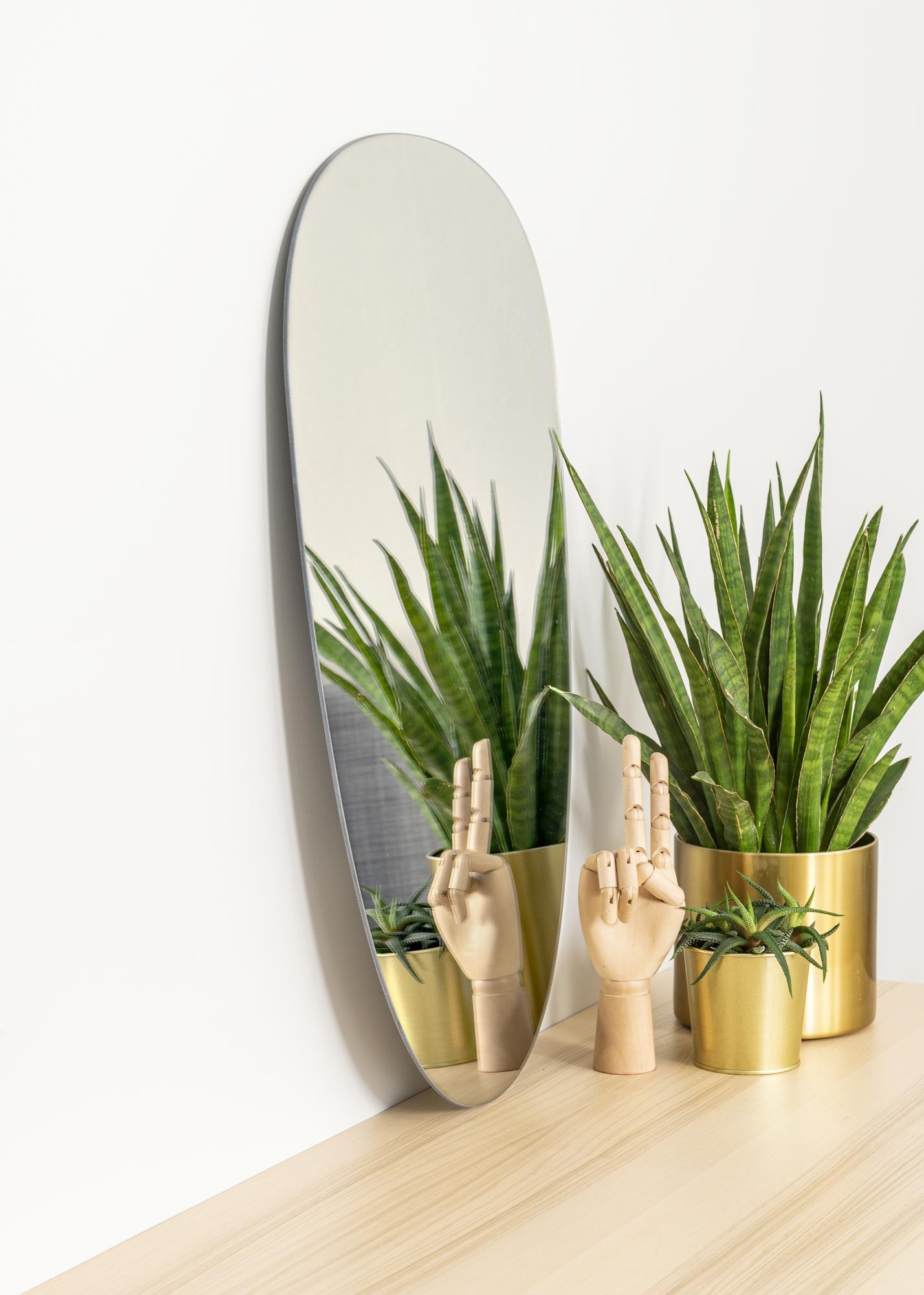 Elegantné a zaujímavé zrkadlo ako toto bude moderným prvkom vo vašom interiéri! Zrkadlo má jemný a asymetrický tvar, ktorý možno najlepšie popísať ako nerovnomerne oválny. Zrkadlo je navyše veľmi tenké a nemá žiadny rám, čo ešte viac podčiarkuje jeho elegantný vzhľad.