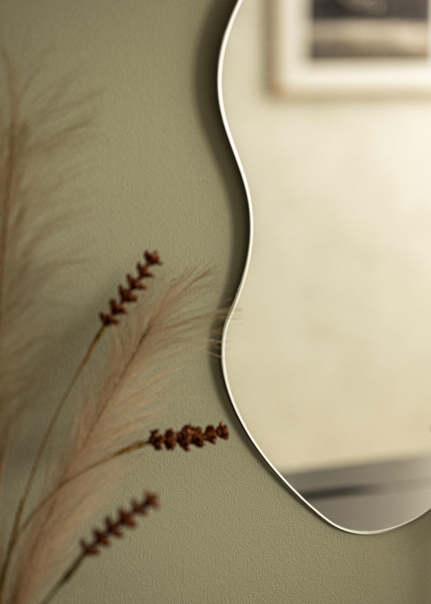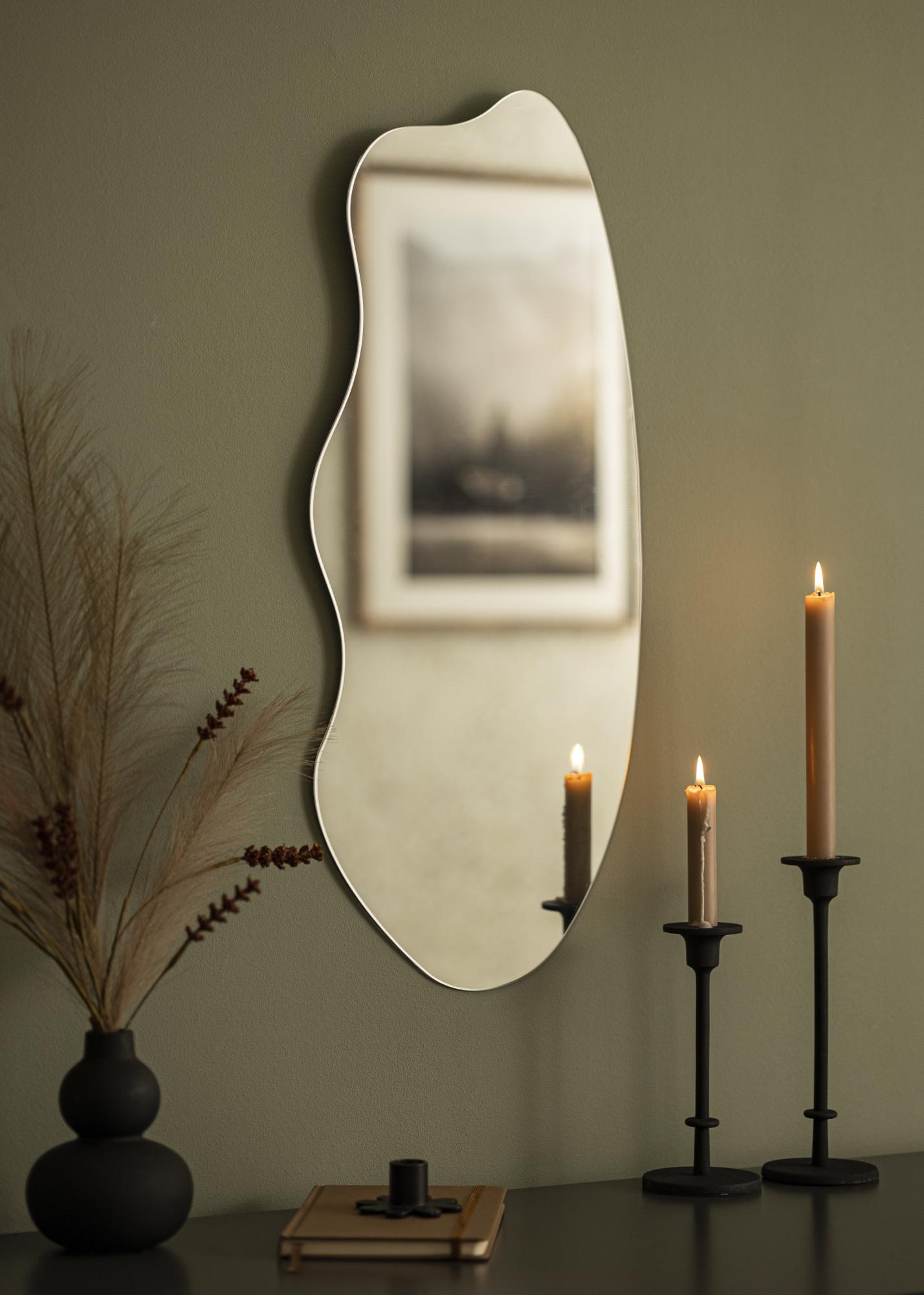 Asymetrické nástenné zrkadlo sa stane výrazným interiérovým prvkom v každom dome. Toto zrkadlo má jedinečný tvar, kde jedna dlhá strana je zaoblená a druhá má vlnitý tvar. Spoločne tvoria vzrušujúci a elegantný celok. Zrkadlo sa hodí rovnako dobre v predsieni ako aj v obývacej izbe a poslúži aj ako trendy kúpeľňové zrkadlo.