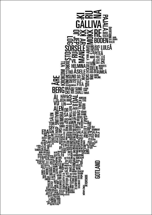 Naučte sa názvy všetkých obcí vo Švédsku pomocou tejto kreatívnej mapy Švédska! Čiernobiely plagát zobrazuje mapu Švédska, ktorá pozostáva len z textu. Text štýlovo ukazuje, kde sa v krajine nachádzajú jednotlivé obce.