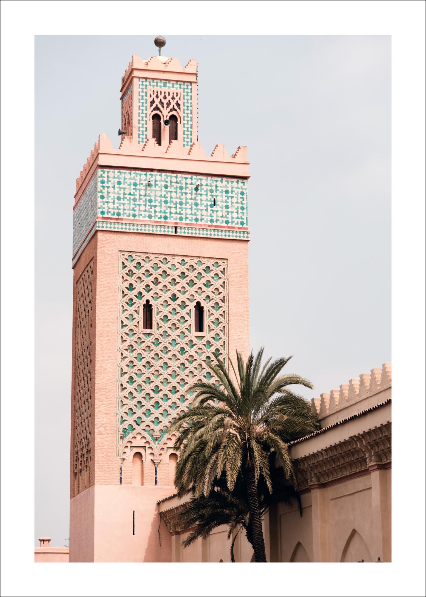 Plagát s mešitou Kutubiyya v Marrákeši na dennom svetle. Krásne farby broskyne a tyrkysu dokonale ladia so svetlomodrou oblohou. Na spodnej časti obrázka stojí osamelá palma so svojimi vetvami, ktoré zakrývajú dolnú časť strechy mešity. Táto broskyňovo sfarbená kamenná štruktúra vytvára pokojný pocit.