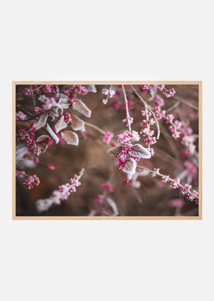 Fotografické umenie s detailným záberom na mrazom postihnuté ružové bobule s malou hĺbkou ostrosti. Tlač s ružovými bobuľami a pozadím v čokoládových tónoch vytvára teplý a útulný pocit. Vo väčšej veľkosti s pekným rámom sa obraz stane stredobodom pozornosti v obývačke alebo umiestnite menšiu verziu do koláže obrazov spolu s ďalšími plagátmi v rovnakých farebných odtieňoch.