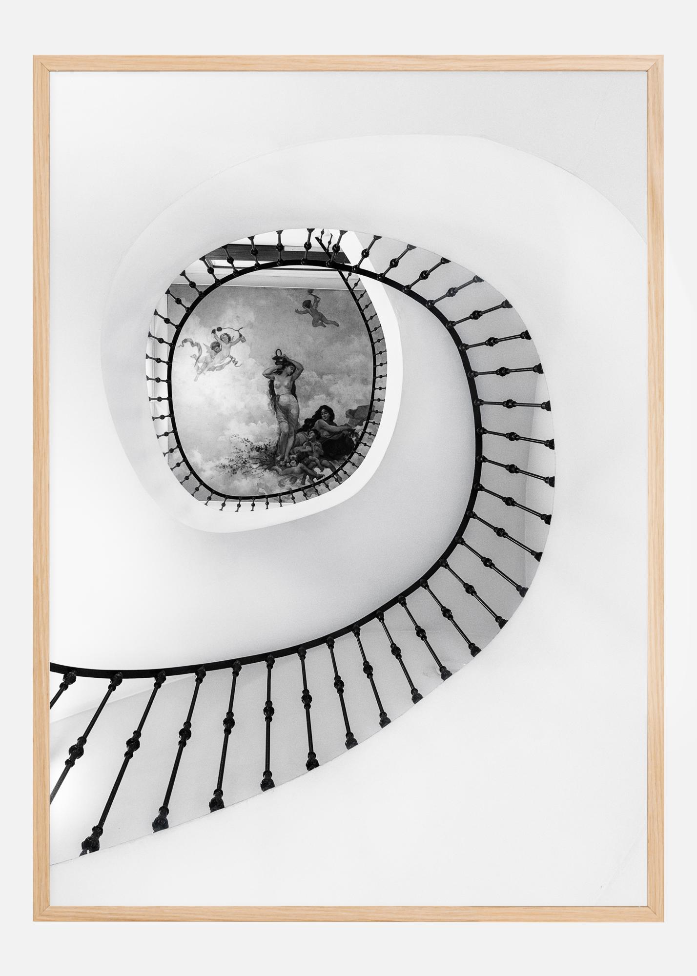 Krásny čiernobiely plagát so špirálovým schodiskom. Vďaka čiernemu zábradliu z tepaného železa vás toto nádherné špirálové schodisko vedie k nádhernej freske s nahými ženami a kerubmi. Zaveste tento tlač na jednoduchú bielu stenu a vytvorte pocit nekonečnosti.