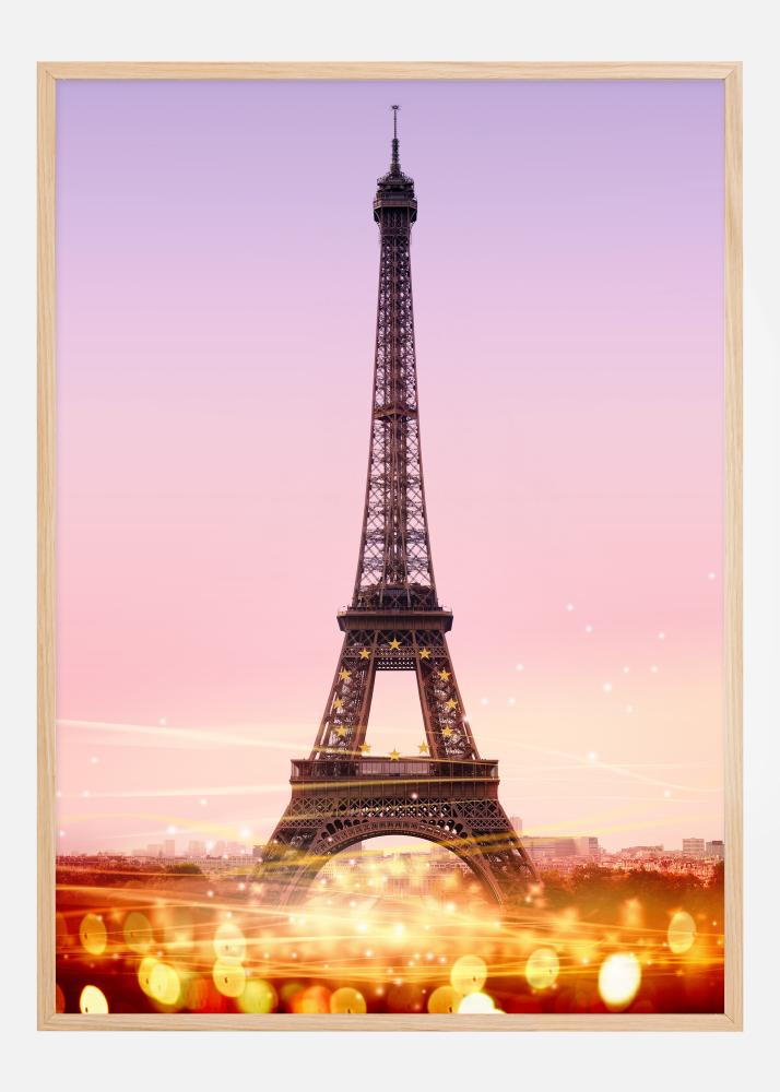 Táto plagát zachytáva majestátnu Eiffelovu vežu za súmraku. Jemné pastelové farby na oblohe vytvárajú romantické pozadie pre tento ikonický monument, zatiaľ čo mestské svetlá dole žiaria ako hviezdy, čo pridáva pocit mágie a snovosti. Je to pocta Parížu, mestu svetla, a jeho schopnosti inšpirovať lásku a zázrak.