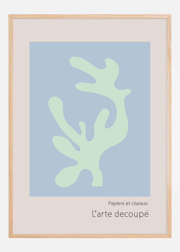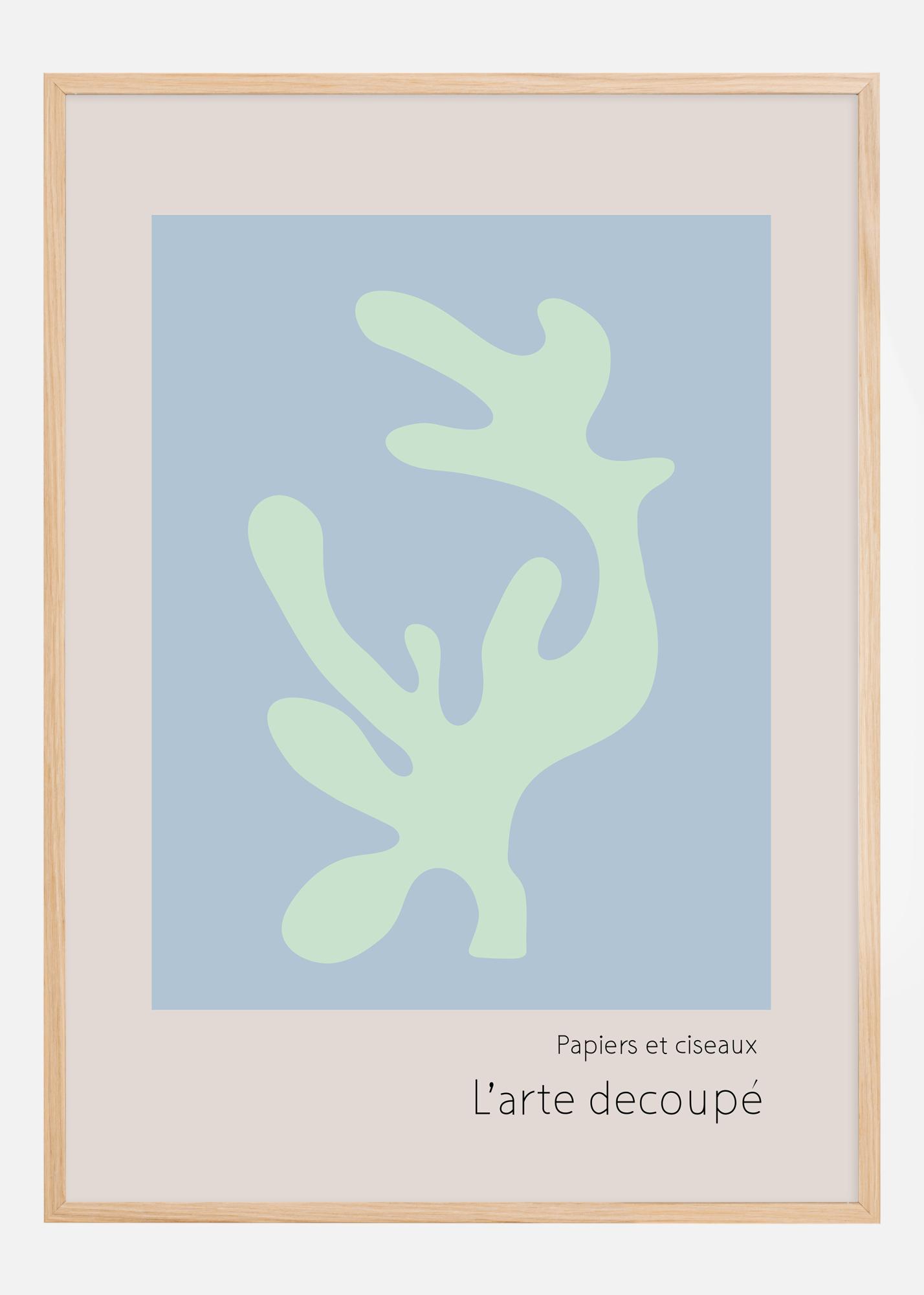Tento sofistikovaný a minimalistický plagát vzdáva hold 'L'arte decoupé', umeniu strihania do papiera, čo je elegantná a nadčasová forma umeleckého vyjadrenia. Zobrazuje abstraktnú formu v upokojujúcom pastelovom zelenom odtieni, ktorá sa vznáša na jemne modrom pozadí, čo vytvára ilúziu ľahkosti a prchavosti. Jednoduchý tvar, ktorý je zároveň organický a otvorený na interpretáciu, pozýva diváka preskúmať negatívne priestory a nájsť si vlastný význam v tomto vyrezanom vzore.