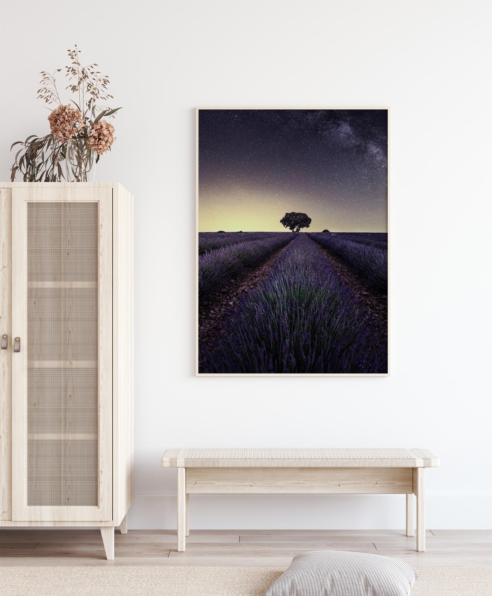 Úplne očarujúci plagát levanduľového poľa. Intenzívne odtiene fialovej levandule, ktoré sú dokonale prispôsobené k sebe, tancujú v rannom vánku. Osamelý strom je osvetlený ranným slnkom a doplnený tmavou hviezdnou oblohou. Zaveste tento obraz do kuchyne pre prirodzenú atmosféru.
