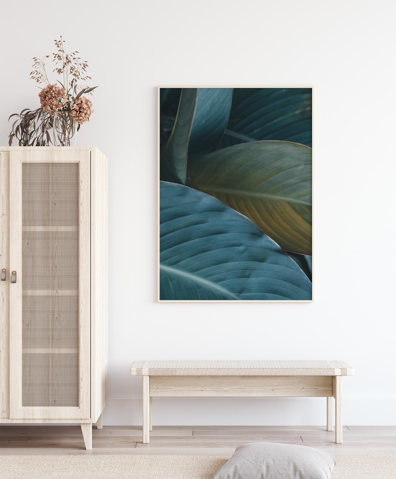 Záber zblízka na listy. Jednoduchosť tohto plagátu sa odráža v rôznych odtieňoch zelenej, ktoré sú reprezentované. Listy sú svetlejšie smerom k stredu. Prirodzené svetlo svieti na okrajoch a dodáva listom zlatistý vzhľad. Krásna tlač na zavesenie do miestnosti plnej rastlín.