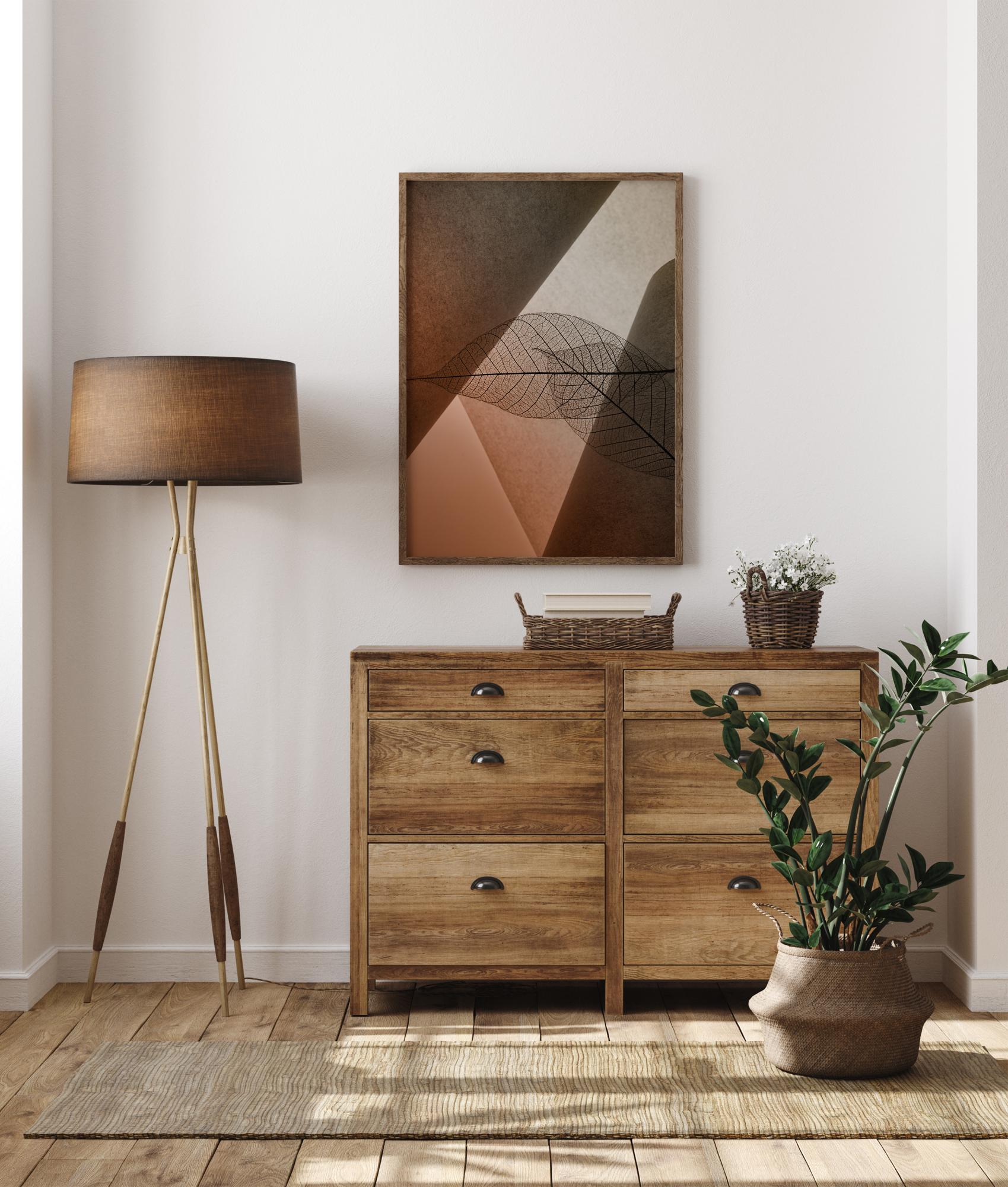 Úžasný obraz dvoch listov, ktoré sú zobrazené proti slnečnému svetlu. Svetelný lúč zvýrazňuje žilky listov. Krásny obraz dominuje rôznymi odtieňmi hnedej, zatiaľ čo pozadie sa vyznačuje drsnými aj hladkými časťami, ktoré odrážajú svetlo. Perfektný plagát na pridanie svetla do miestnosti.