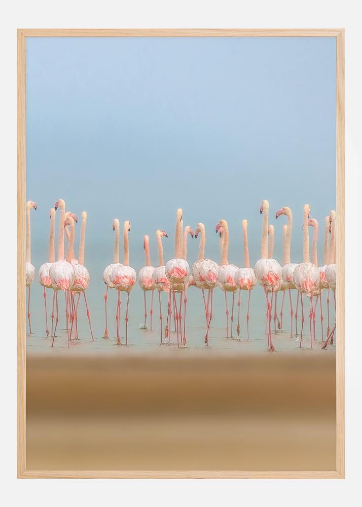Spektakulárny plagát s kŕdľom plameniakov pri brehu vody. Úžasné tvory sú zachytené zozadu a ich farba je zvýraznená neutrálnymi tónmi oblohy a piesku. Ideálne umiestniť do spálne vďaka jeho fantáziu podnecujúcej jemnosti.