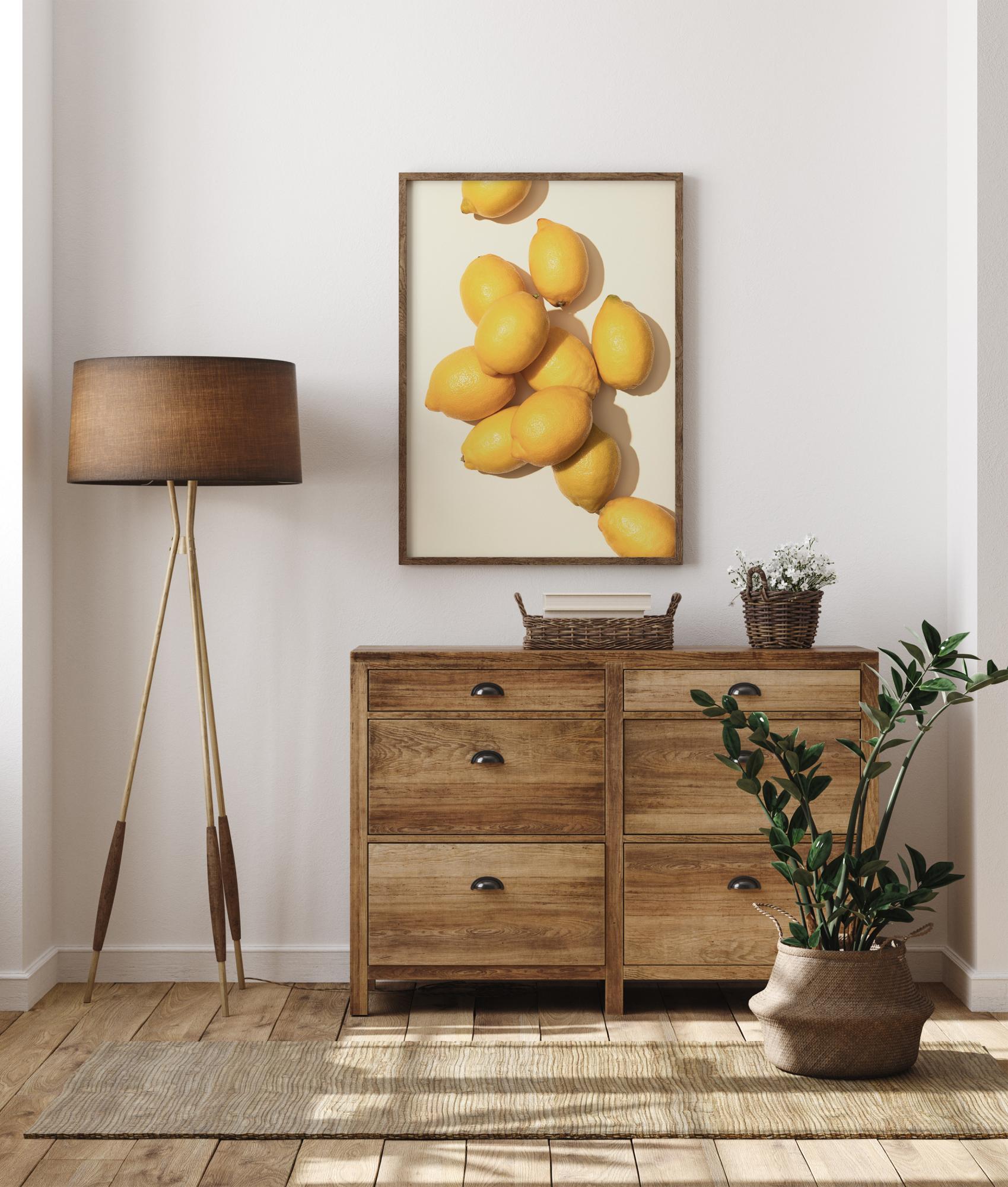Realistický plagát citrónov. Svetlo zhora sa premieta priamo na ovocie, čo zvýrazňuje drsnosť šupky. Svetlo vytvára tiene, ktoré sa tiahnu po bielom pozadí. Cíťte vôňu sviežosti tohto citrusového ovocia, keď zavesíte tento výtlačok vo svojej kuchyni.
