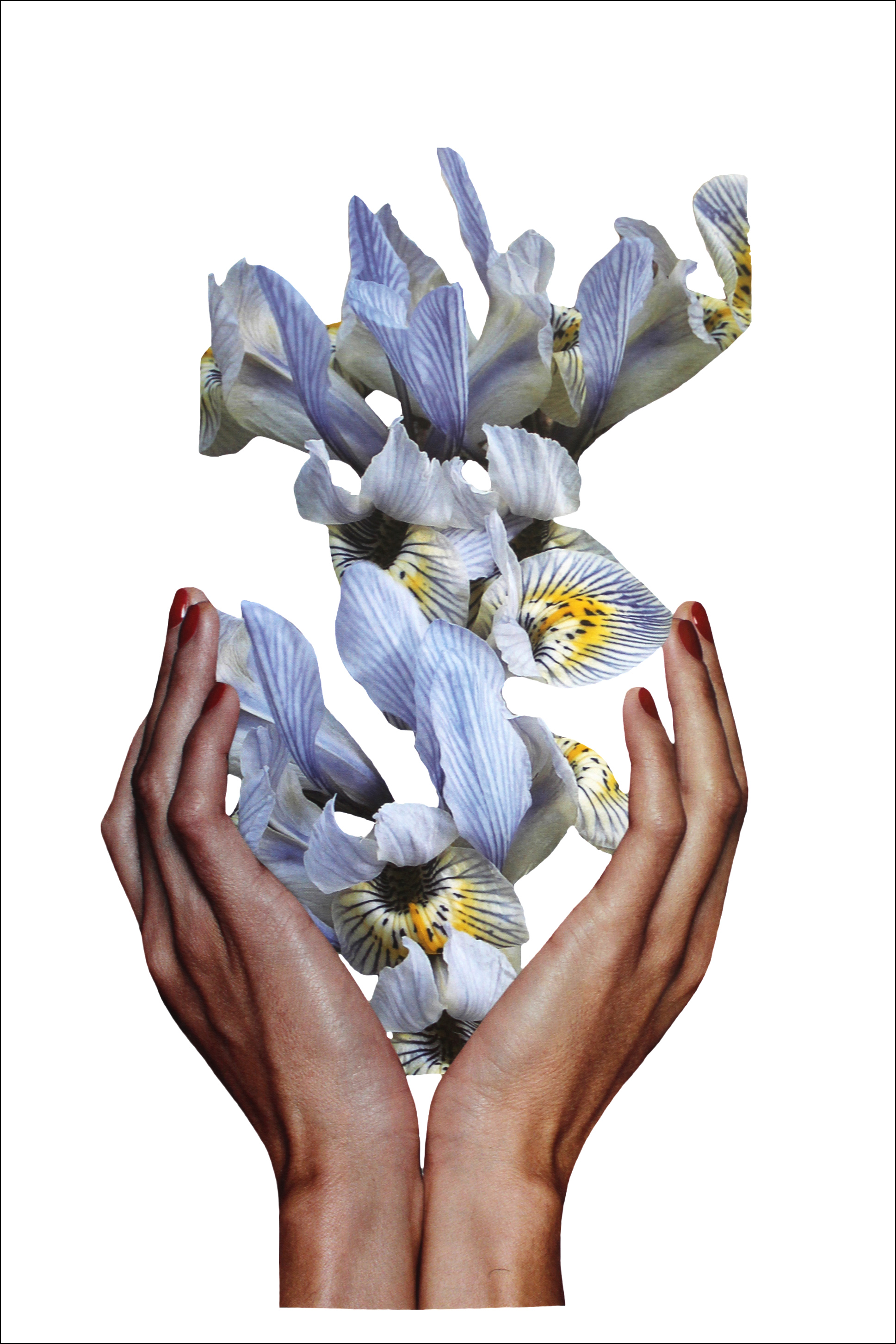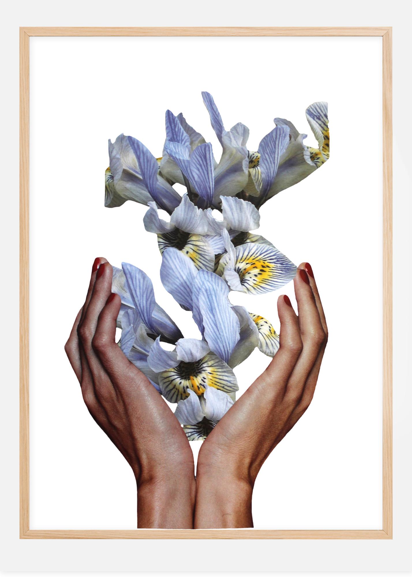 Krásny kvetinový obraz bledofialových kosatcov. Opatrné otvorené ruky s krásne nalakovanými nechtami jemne držia kosatce. Biele pozadie zvýrazňuje jemné fialové a žlté farby a vytvára jemný, ale krásny kvetinový obraz. Pokojný plagát, ktorý oživí jednoduchú bielu stenu.
