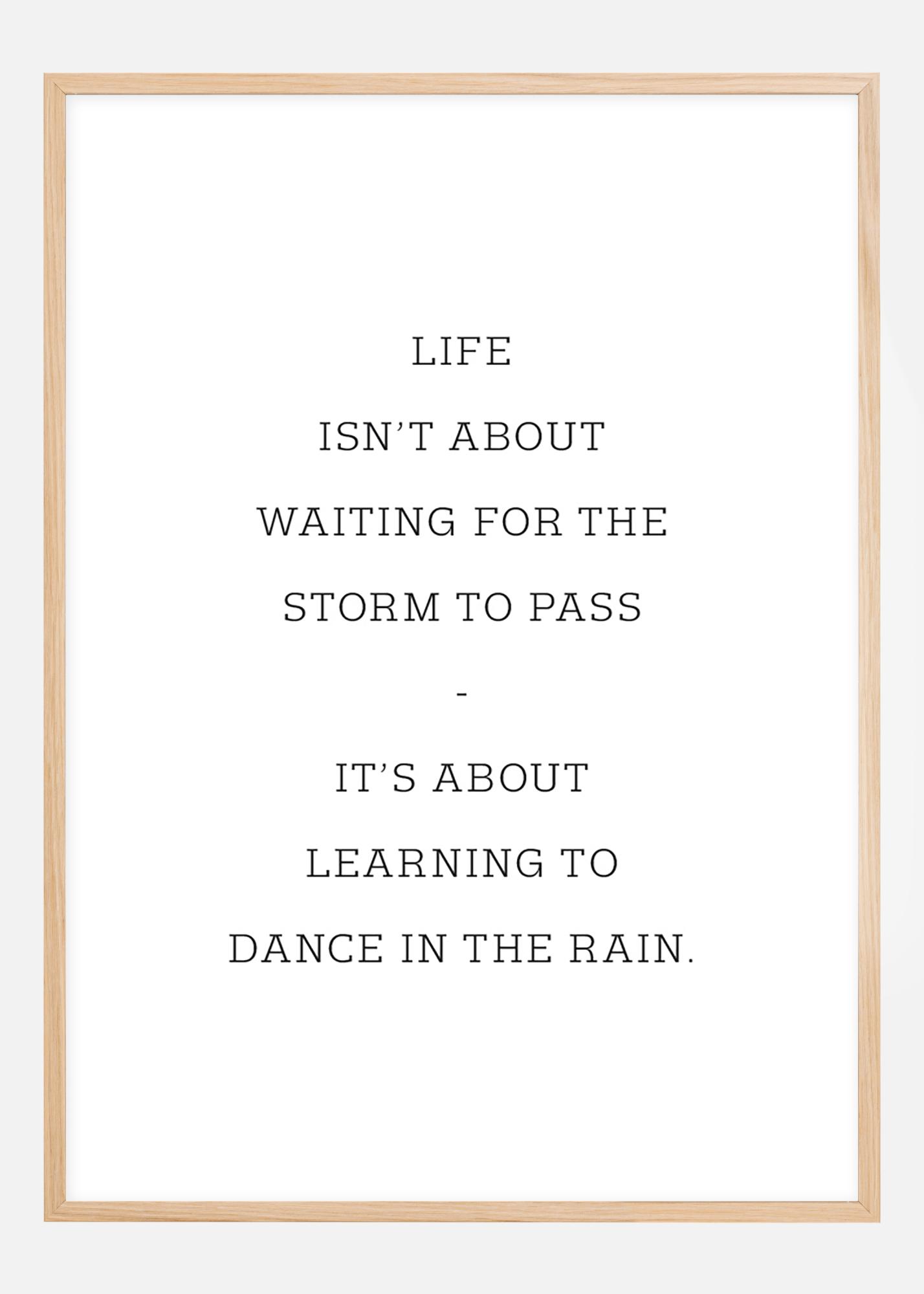 Významná čiernobiela motivačná tlač, ktorá zdôrazňuje význam riešenia problémov. Napísané jednoducho hrubými čiernymi veľkými písmenami, takže je posolstvo jasne zrozumiteľné. Život nie je o čakaní, kým búrka prejde - ide o učenie sa tancovať v daždi. Jednoduchý, ale moderný plagát na zavesenie na bielu stenu.