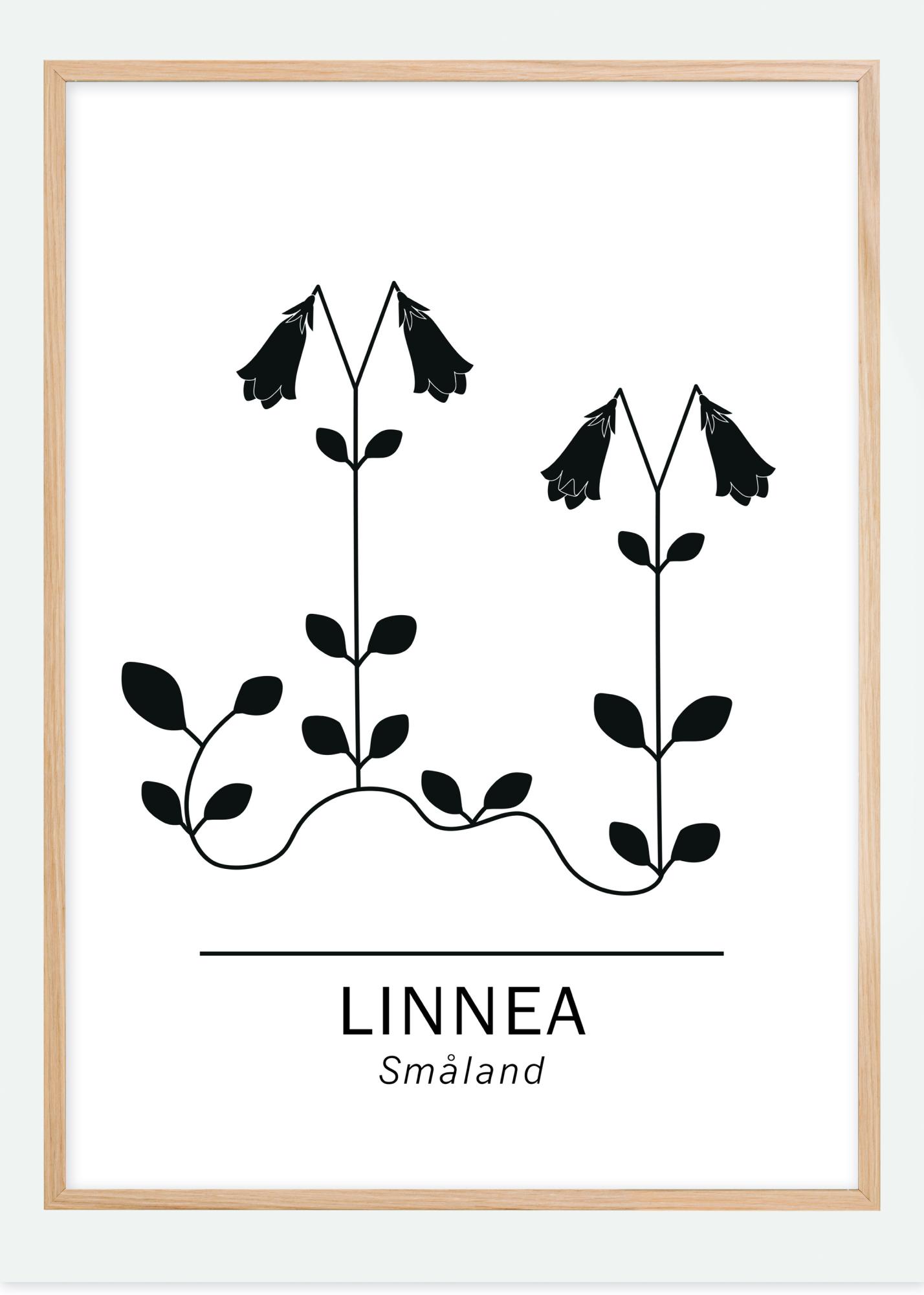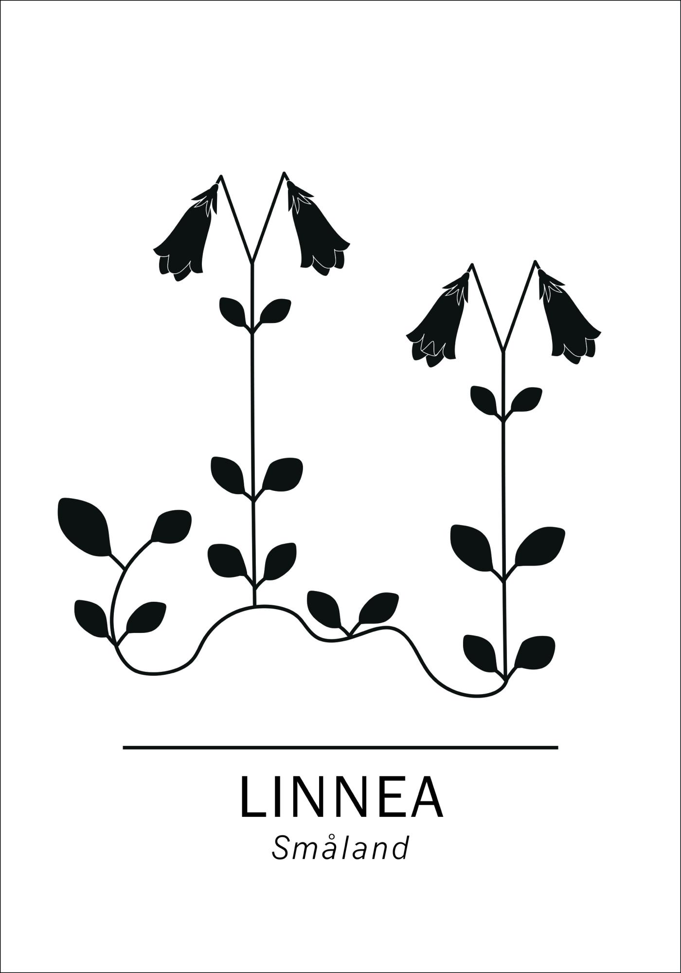Krásny čiernobiely minimalistický obraz v čiernej a bielej farbe s dvomi čiernymi Linnea. Pod kvetmi je zvlnený rad listov, ktorý spája dva stopky a text ”Linnea, Småland”. Neskromný, ale štýlový obraz, ktorý vytvára pocit jednoduchosti. Zaveste tento plagát na obyčajnú bielu stenu, aby ste vytvorili umelecký vzhľad.