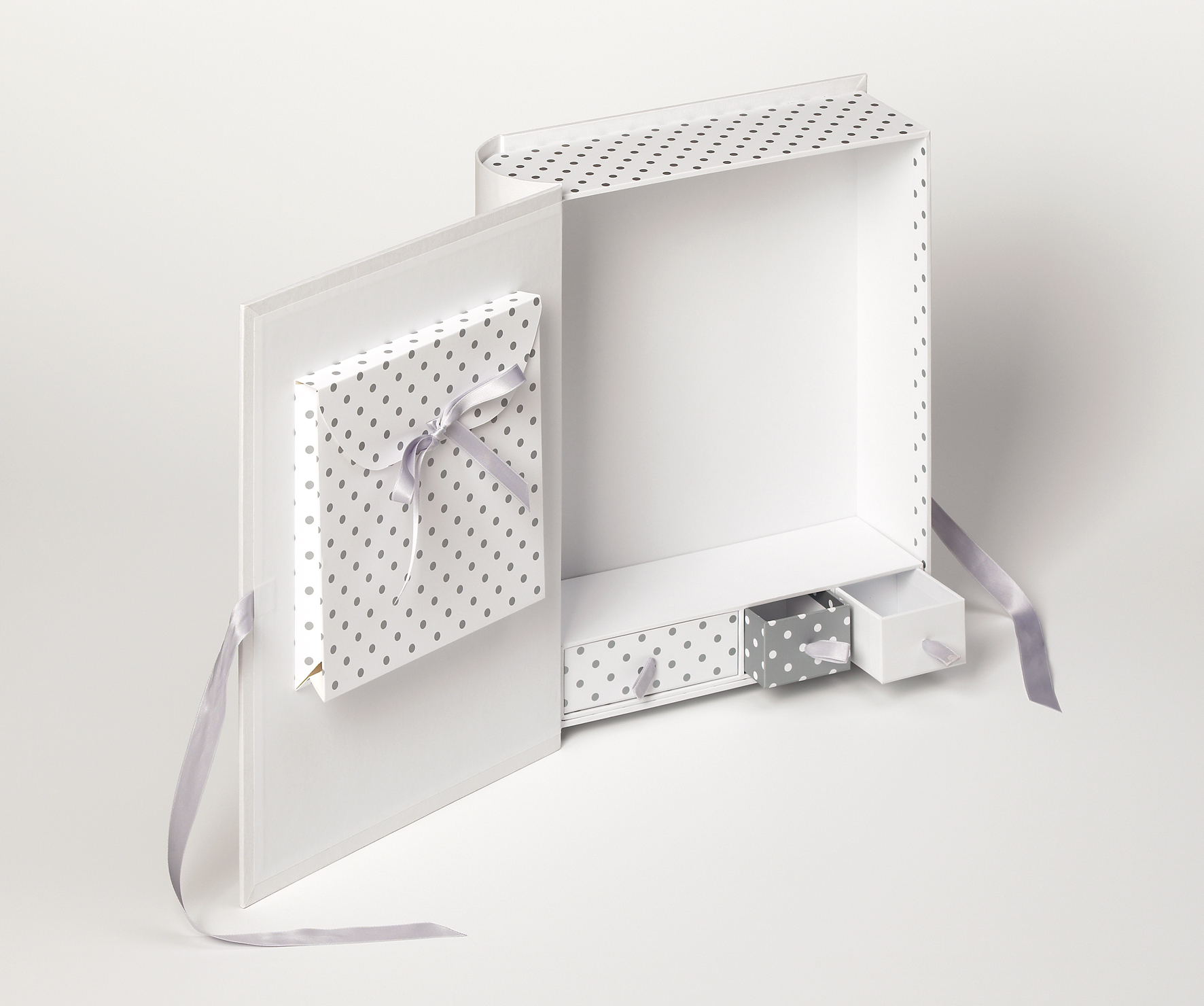 Pekná úložná škatuľka na obrázky a malé predmety. V škatuľke sú 3 menšie zásuvky, ktoré sú ideálne napríklad na prvý zub. Je tam tiež úložné vrecko, ktoré môžete uzavrieť. Na prednú stranu škatuľky môžete vložiť vlastný obrázok na pridanie osobného nádychu.
