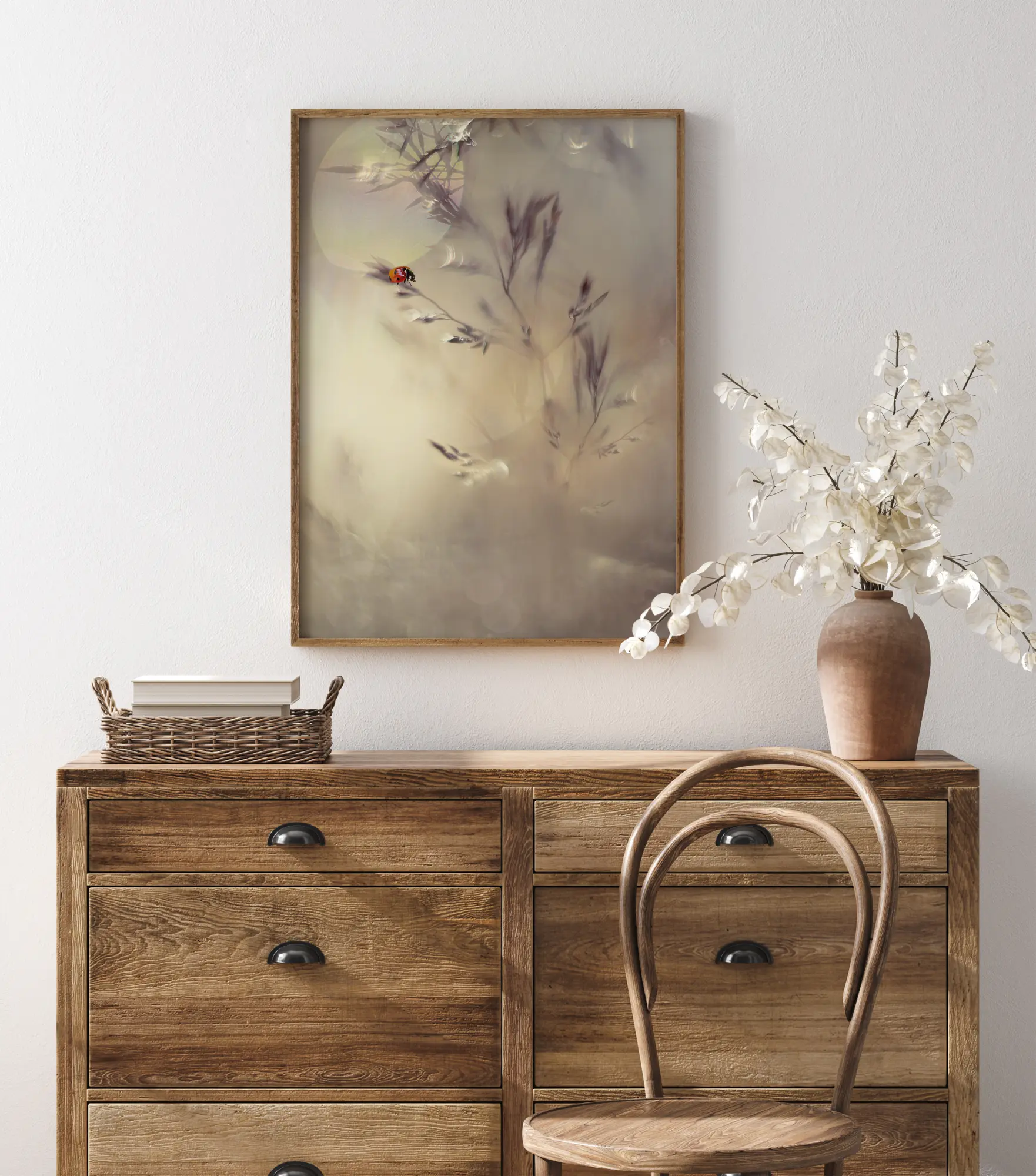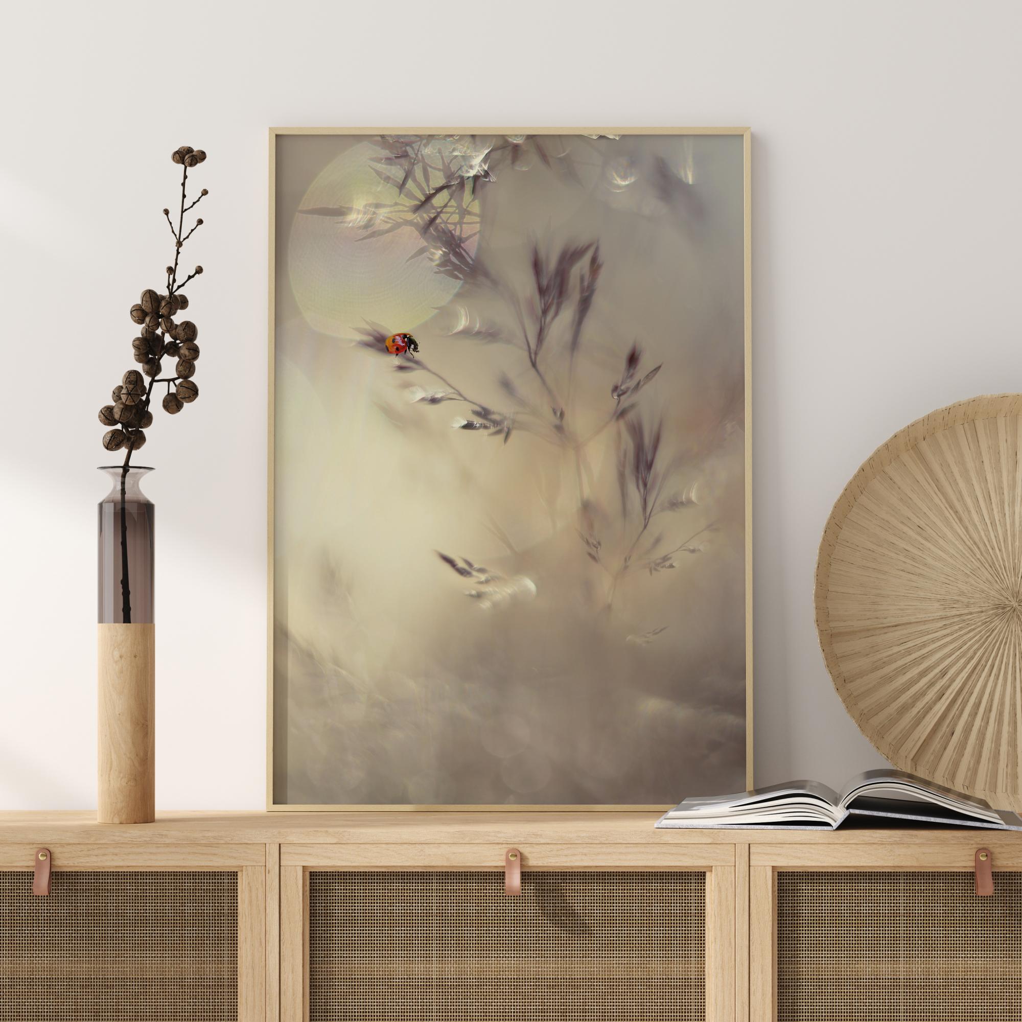 Mlžná plagát s krásnou lienkou na vyschlej tráve. Slnko odrážajúce sa v diaľke zvýrazňuje silné čierne a červené farby lienky. Krásne, hmlisté farby prinášajú pocit pokoja a ticha. Krásna potlač na zavesenie do spálne.