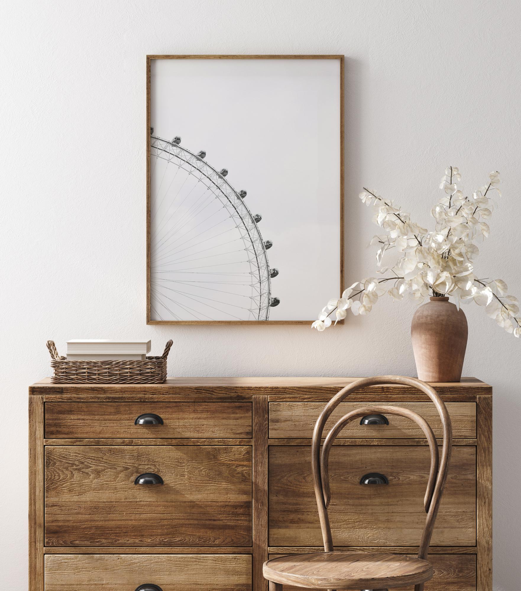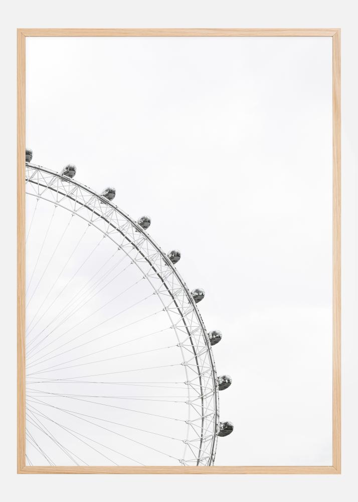 Pôsobivá čierno-biela tlač Londýnskeho oka. S šedou londýnskou oblohou v pozadí vedú lúče kolesa pohľad k deviatim kabínam pre pasažierov. Skutočne pôsobivý plagát, ktorý zdôrazňuje túto veľkolepú technickú konštrukciu. Predstavte si výhľad z jednej z týchto kabín.
