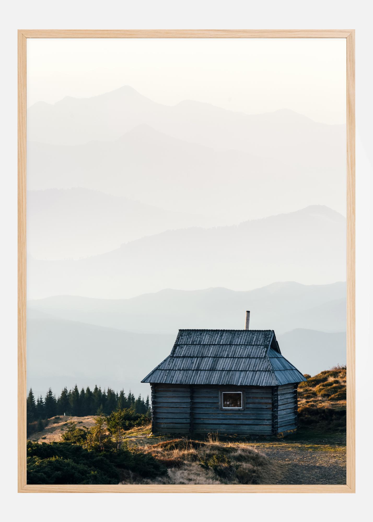 Jednoduchá, malá modrá chata na vrchole hory. Vzdialené kopce v hmlistom pozadí vytvárajú magický obraz. Vľavo od chaty dodávajú tmavozelené borovice extra farbu tomuto jednoduchému, ale krásnemu plagátu. Zaveste ho na svetlú stenu, aby ste vytvorili pocit priestoru.