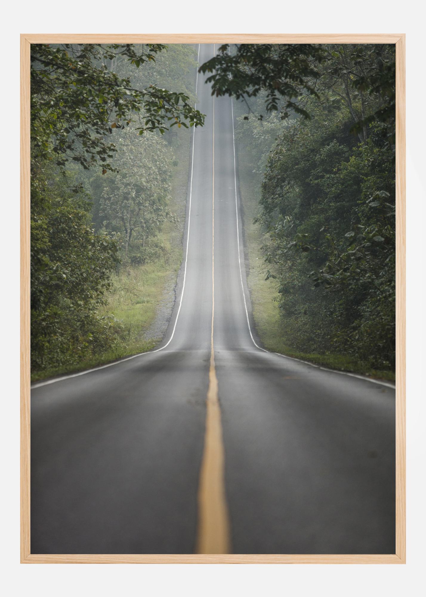 Krásna prírodná potlač osamelej cesty, ktorá vedie stredom lesa. Dlhá, rovná cesta vedie priamo cez stred zelenej lesa a zvýrazňuje žltú čiaru v strede obrazu. Jednoduchý plagát, ktorý vás prinúti zamyslieť sa, kam táto dlhá šedá cesta vedie.