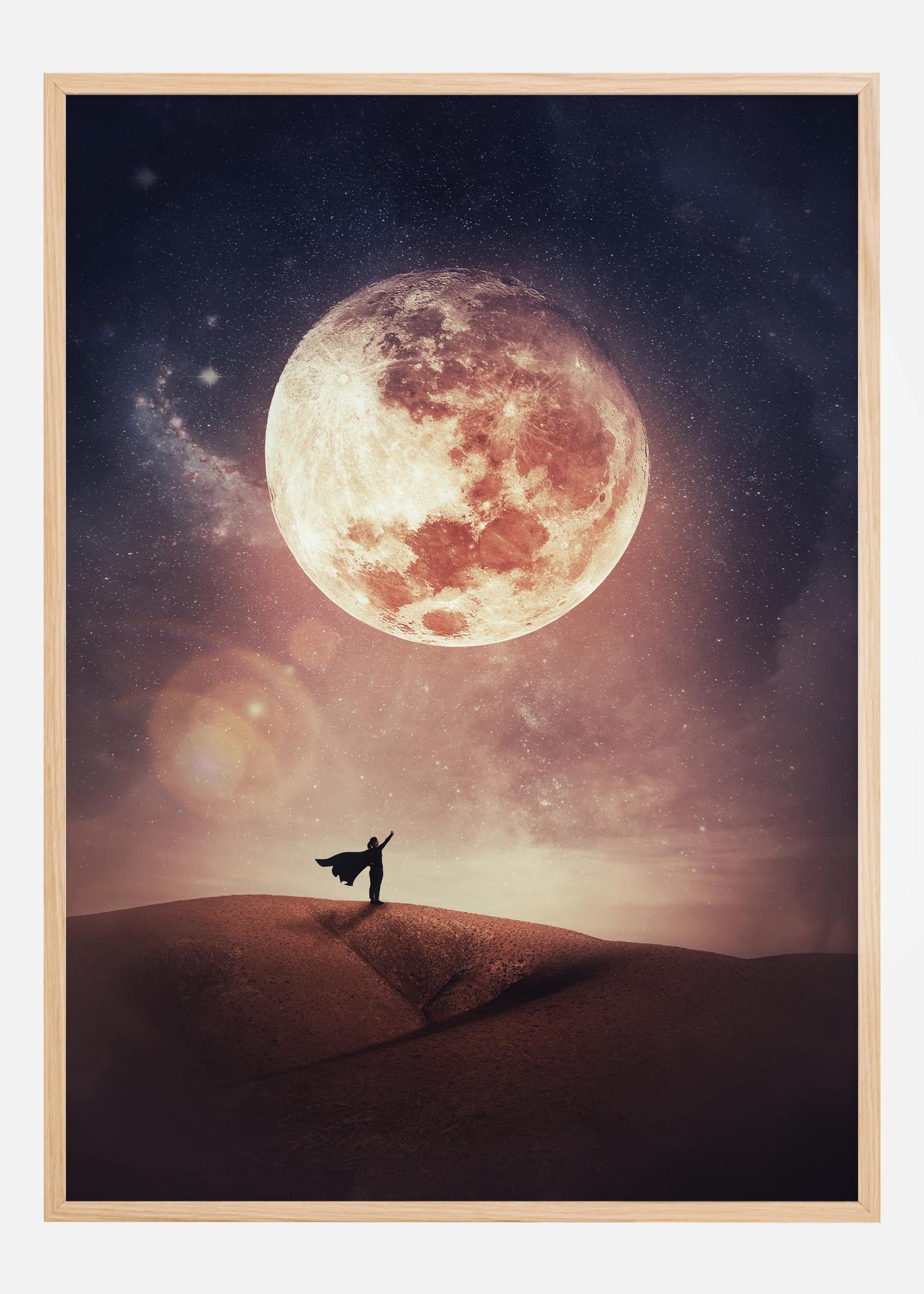 Tento nádherný plagát zachytáva magický moment, kde osamelá postava stojí na piesočnom vrchu a pozerá na obrovský, žiariaci mesiac obklopený hviezdnou oblohou. Scéna je silnou pripomienkou našej pozície vo vesmíre, tak bezvýznamnej, ako aj úžasnej. Vyvoláva pocity túžby a zvedavosti, inšpiruje nás myslieť veľkoryso a snívať bez hraníc.