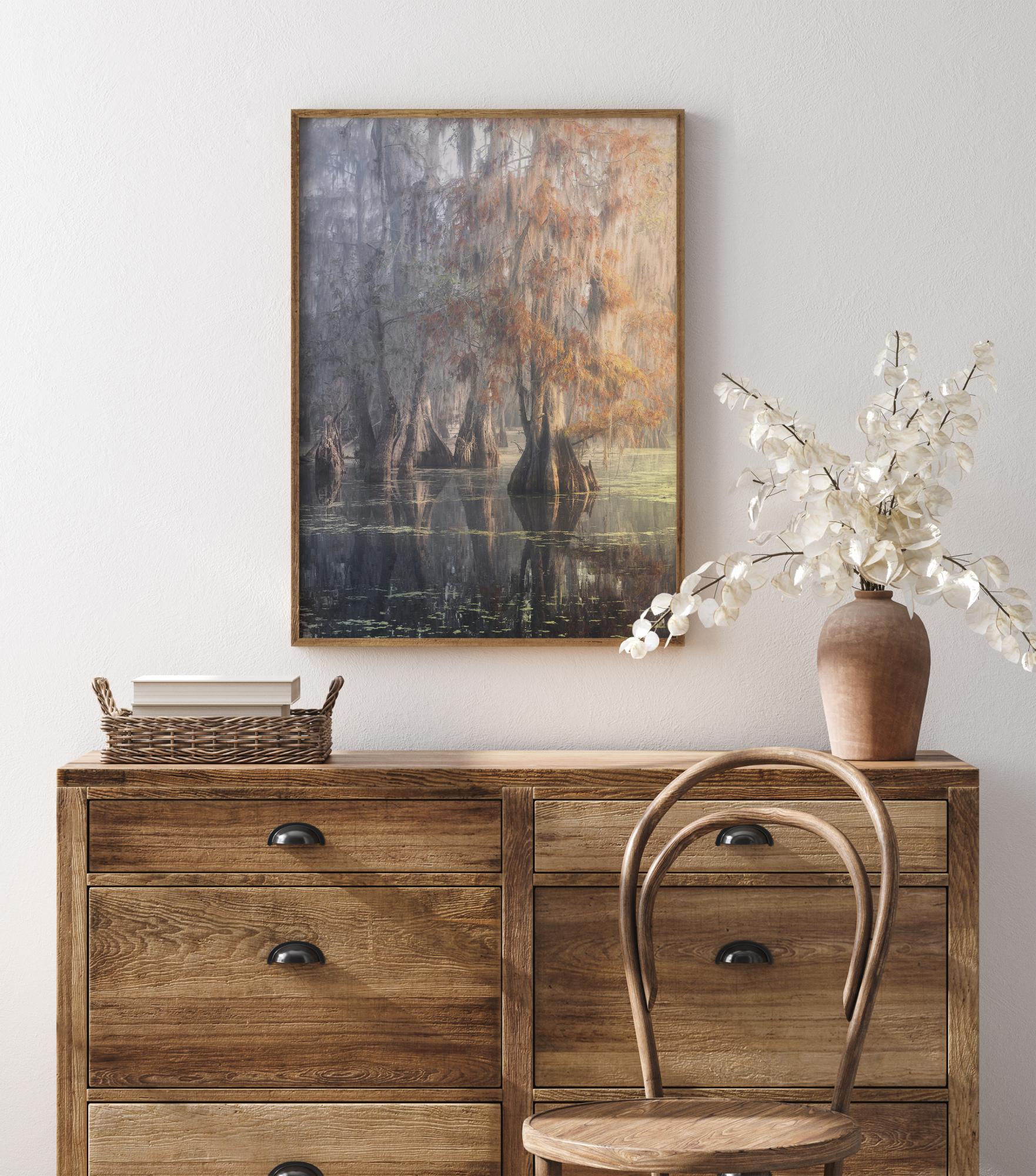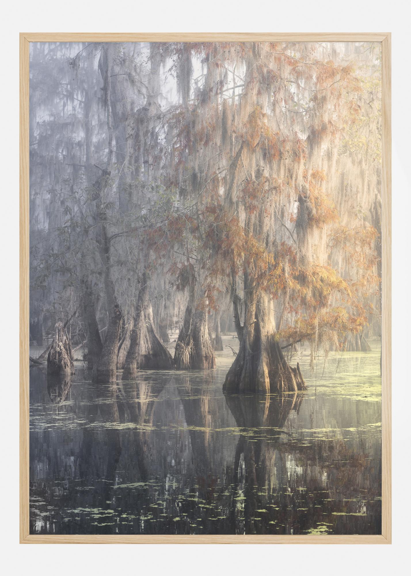 Ohromujúci krásny plagát s močariskom v Louisiane. Výnimočne pokojný obraz močiaru s tichou vodou. Prirodzené svetlo vrhá dokonalé odrazy v močiari a vytvára pocit pokoja. Prineste si prírodu do svojho domova s krásnymi zelenými a hnedými tónmi tejto tlači.