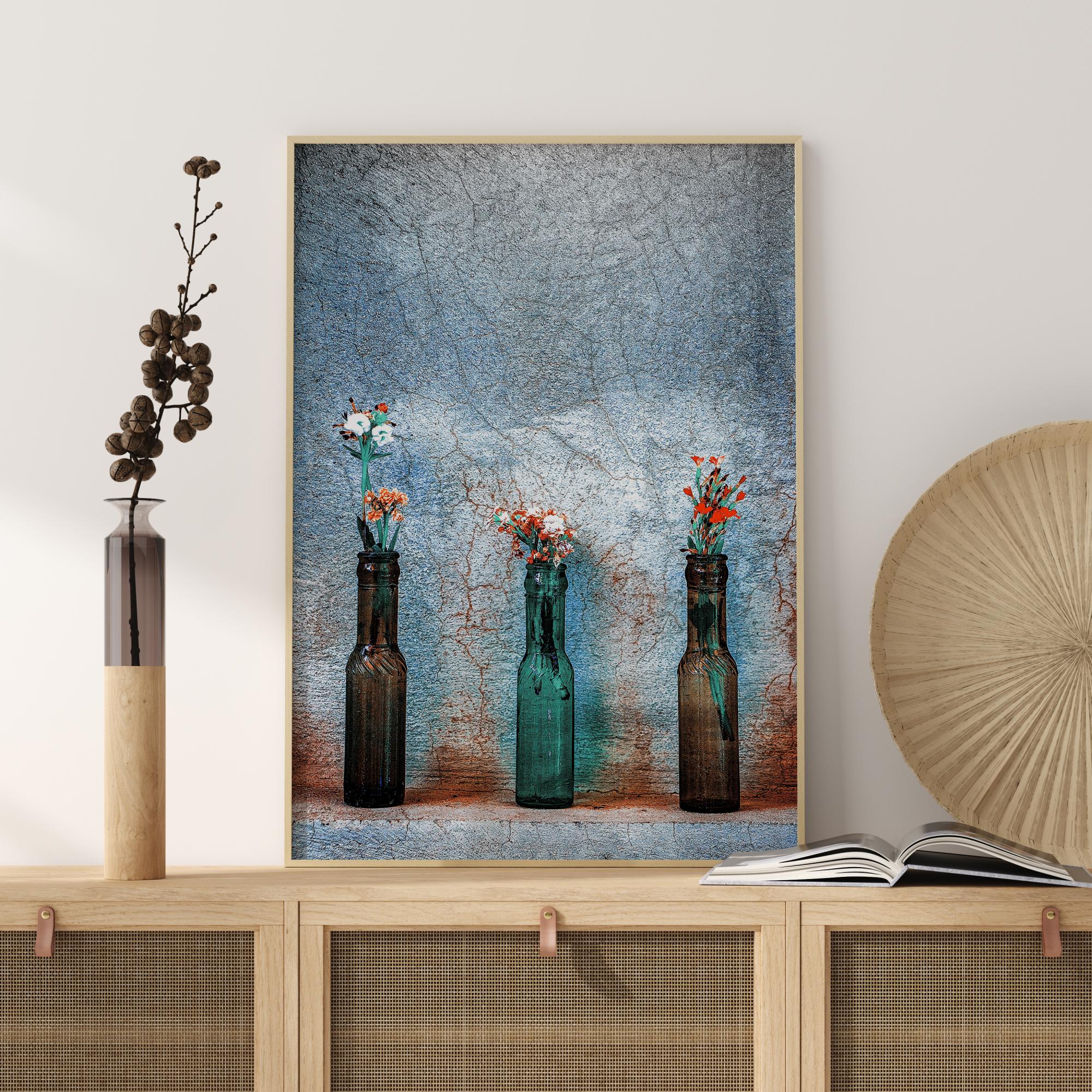 Krásna tlač troch sklenených fliaš proti kamennému povrchu. Každá fľaša obsahuje malé farebné kytice farebných kvetov. Hnedé žilky v kameňoch zvýrazňujú hnedé tiene od fliaš, ktoré sa odrážajú na kamennej polici. Jednoduchý, ale jemný plagát na zavesenie na bielu stenu, aby ste pridali trochu extra farby.