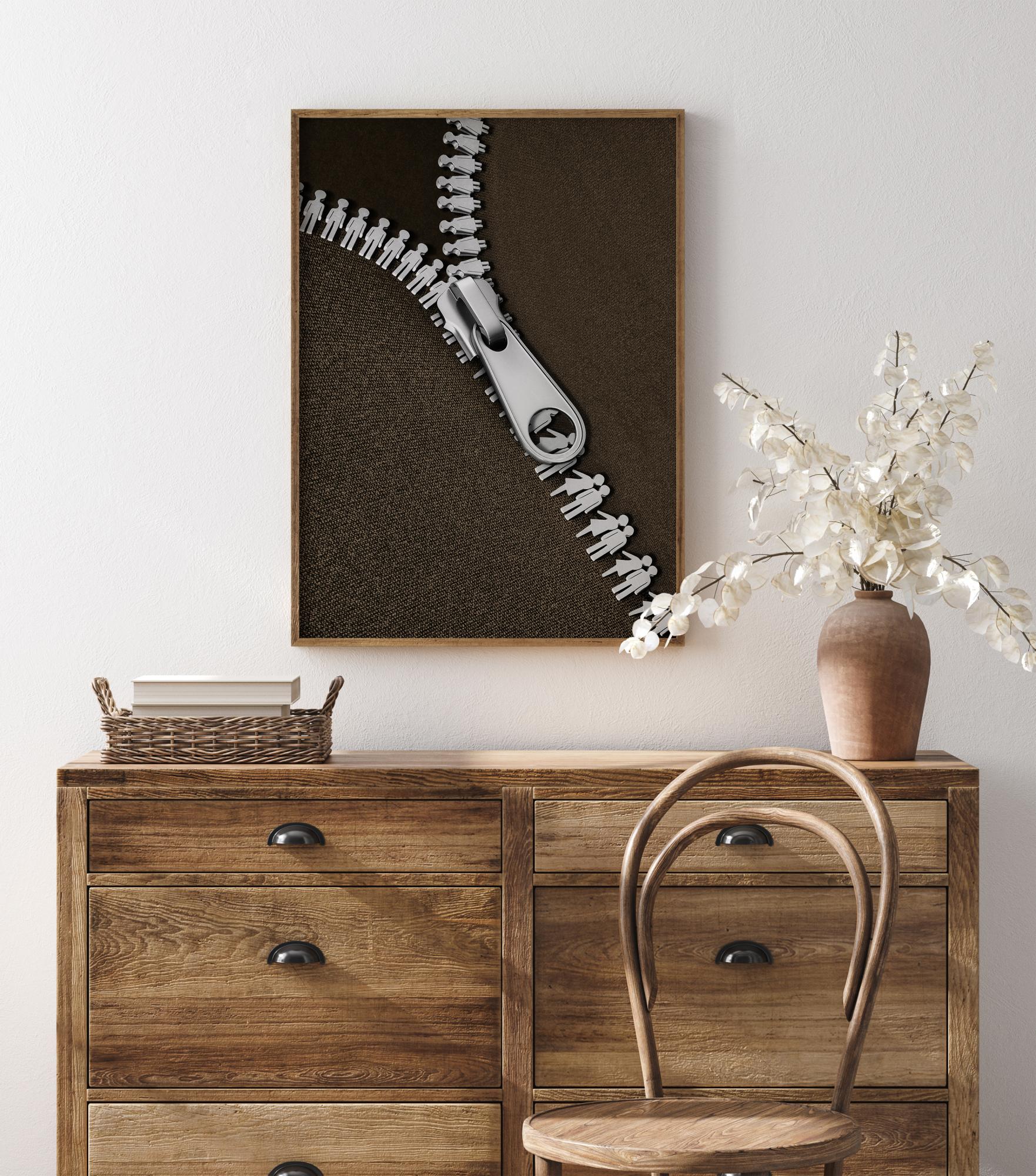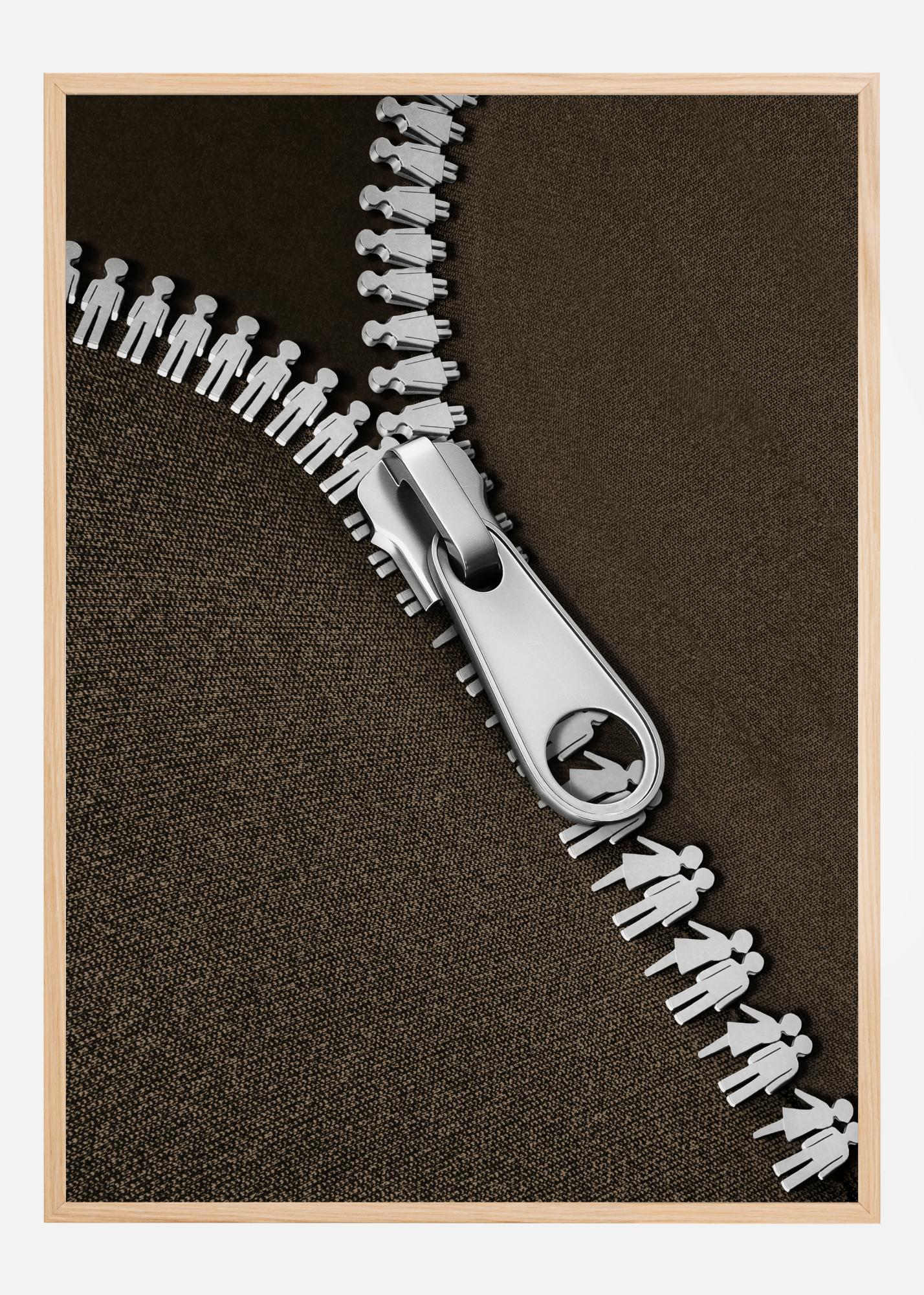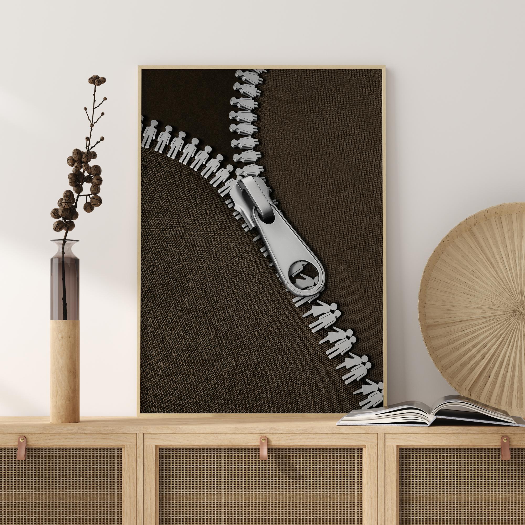 Minimalistická potlač so strieborným zipsom. Strieborný zips na čiernom pozadí zobrazuje dvoch milencov, ktorí sa stretávajú. Na tmavohnedej látke visí strieborná spona nad postavami zipsu. Zábavný plagát pre všetkých, ktorí sa zaujímajú o módu.