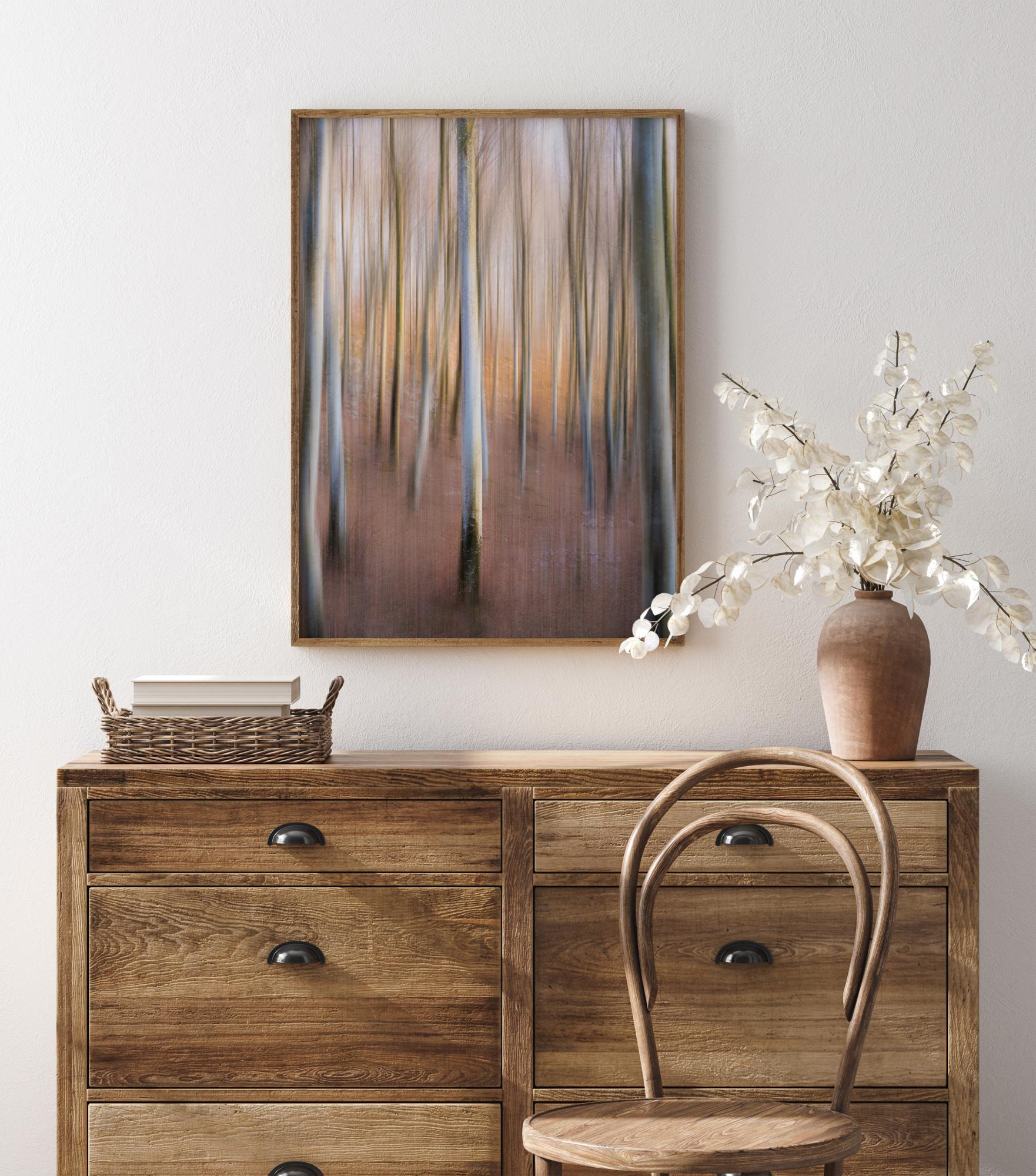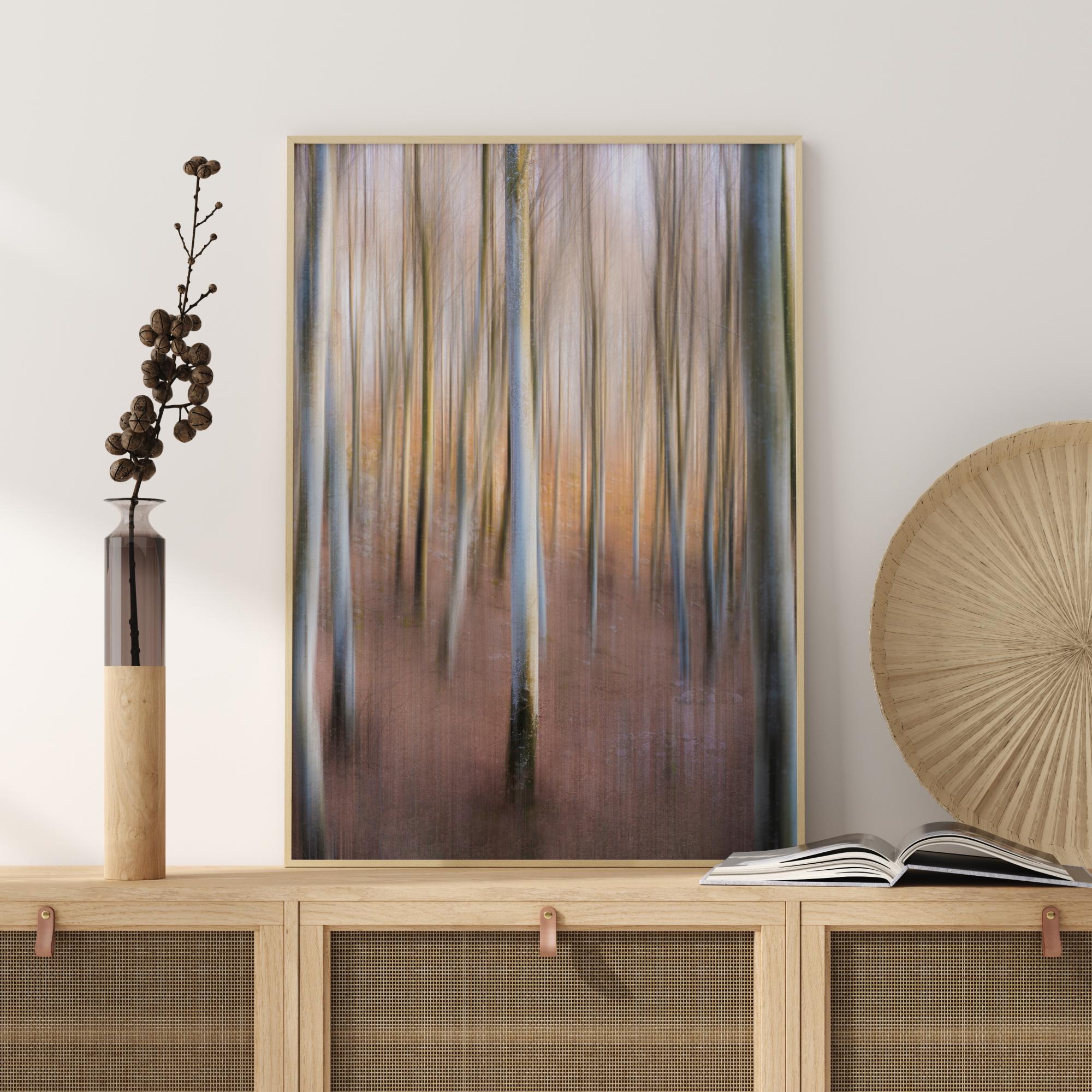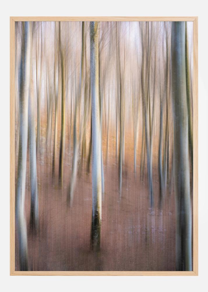 Krásny, ale tajomný plagát s magickým lesom. Prirodzené svetlo preniká cez stromy a magické pastelové farby zdôrazňujú vysoké kmene stromov. Počujte ticho lesa, keď tento obraz zavesíte vo svojom dome.