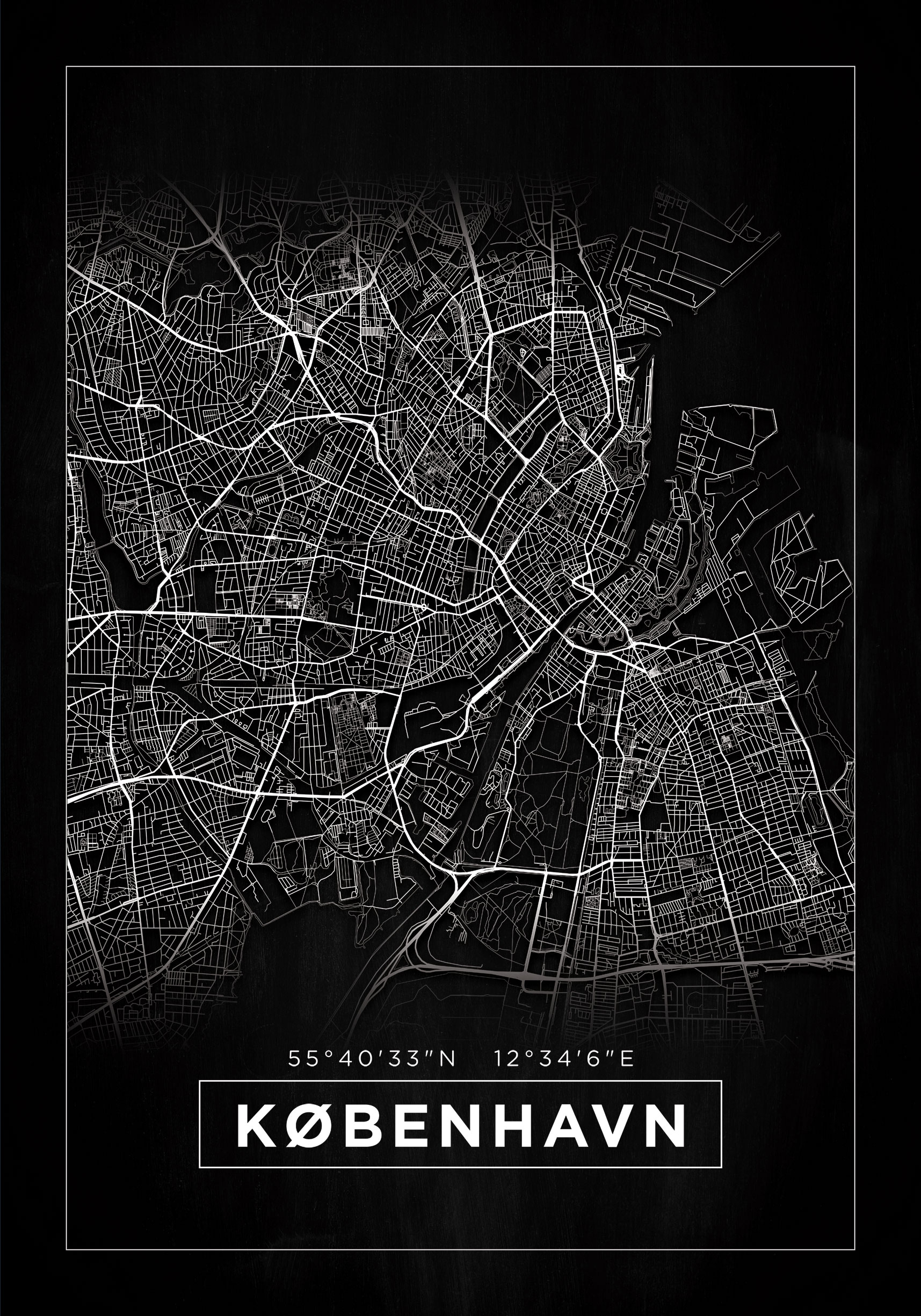 Tu máme naozaj úžasnú mapu mesta Kodaň v čiernobielom prevedení. Tu vidíme celú sieť ulíc mesta v minimalistickom formáte, ktorá sa tiahne od severu na juh. Hore aj dole sa mapa postupne stráca a biele línie miznú na čiernom pozadí. Vo vnútri širšieho čierneho okraja nájdeme tenký biely rám. Dole na obrázku je Kodaň napísaná dánskym pravopisom pre ten správny pocit a hore sú uvedené koordináty mesta. Biely rám, ktorý obklopuje mapu, sa nachádza aj okolo názvu mesta. Tento plagát mapy vytvára naozaj úžasné kontrasty a dodáva miestu skutočnú váhu. Skutočný pútač pozornosti!