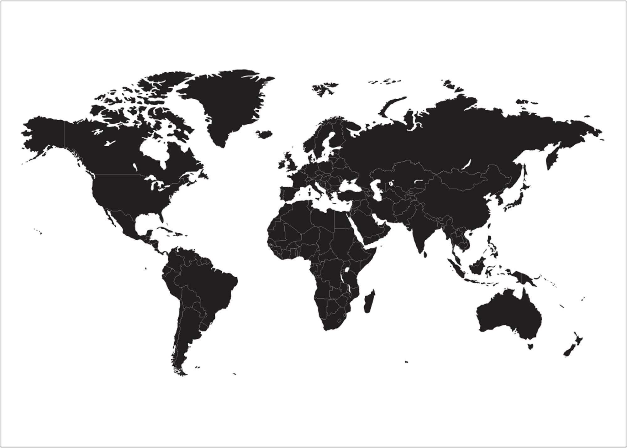 Elegantná čiernobiela mapa sveta s kontinentami v čiernej farbe, kde sú krajiny označené tenkými bielymi líniami. Grafický plakát sa hodí rovnako dobre do moderných minimalistických prostredí ako do interiérov s klasickým nábytkom. Vyberte si krásny rám, ktorý ladí so zvyškom interiéru, aby obraz zapadol do celku, alebo zarámujte mapu s rámom, ktorý skutočne zdôrazní motív a vystúpi na stene.