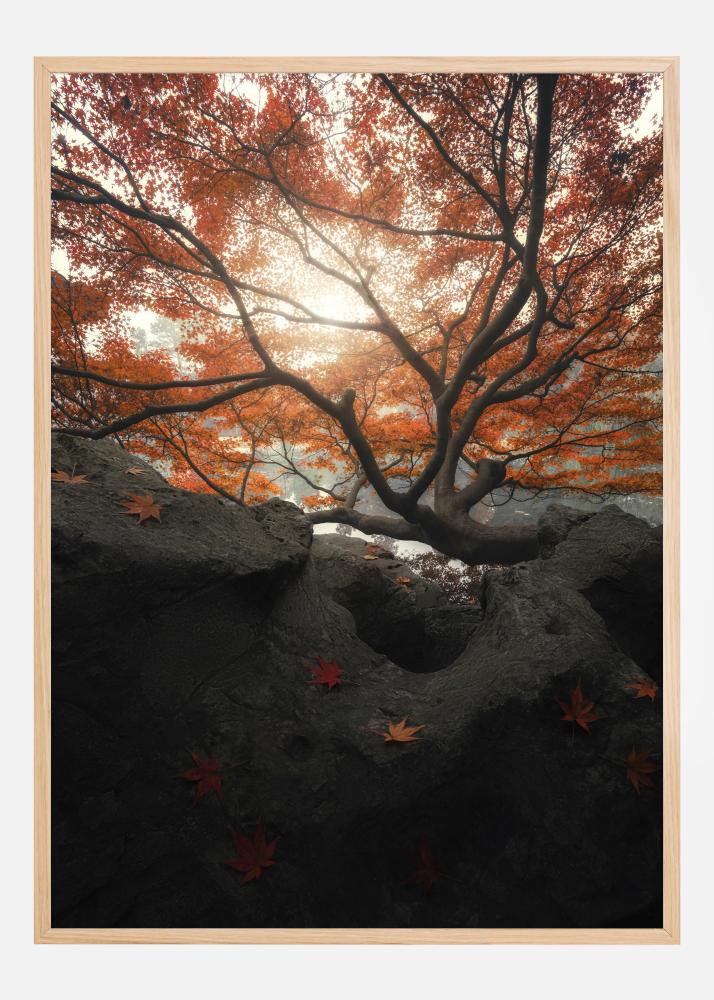 Ohromujúci prírodný plagát s krásnym, oranžovým javorom. Fotografovaný z perspektívy žaby, silné slnečné svetlo prechádza vetvami a vytvára teplý a uvoľnený pocit. V popredí niekoľko červených a oranžových listov spadlo na kmeň. Pridajte trochu prírody s týmto obrázkom vo vašom dome.