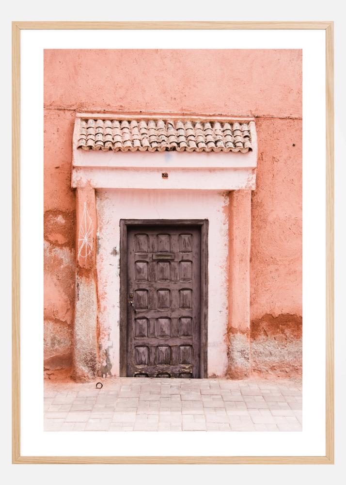 Krásna broskyňová a hnedá potlač hnedých drevených dverí. Marocký dom je natretý v krásnej broskyňovej farbe. Biely múr, ktorý obklopuje dvere, pridáva portrétu ďalší dotyk svetla. Zaveste tento krásny broskyňový plagát na béžovú stenu, aby ste vytvorili pocit harmónie.