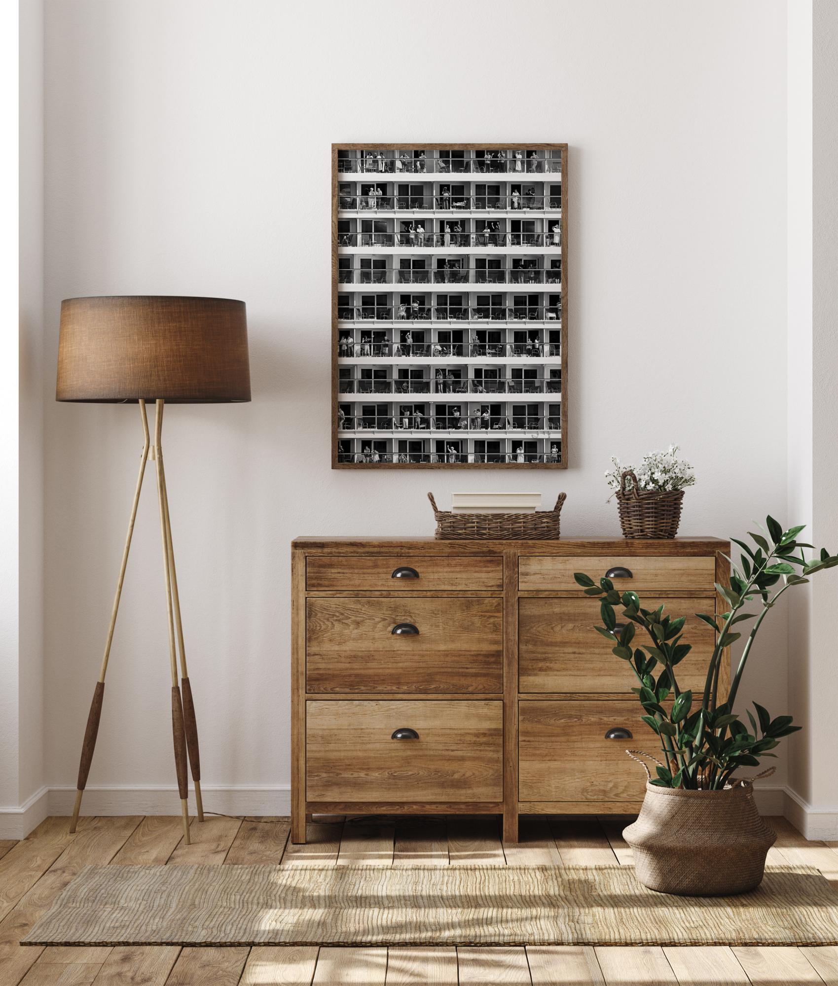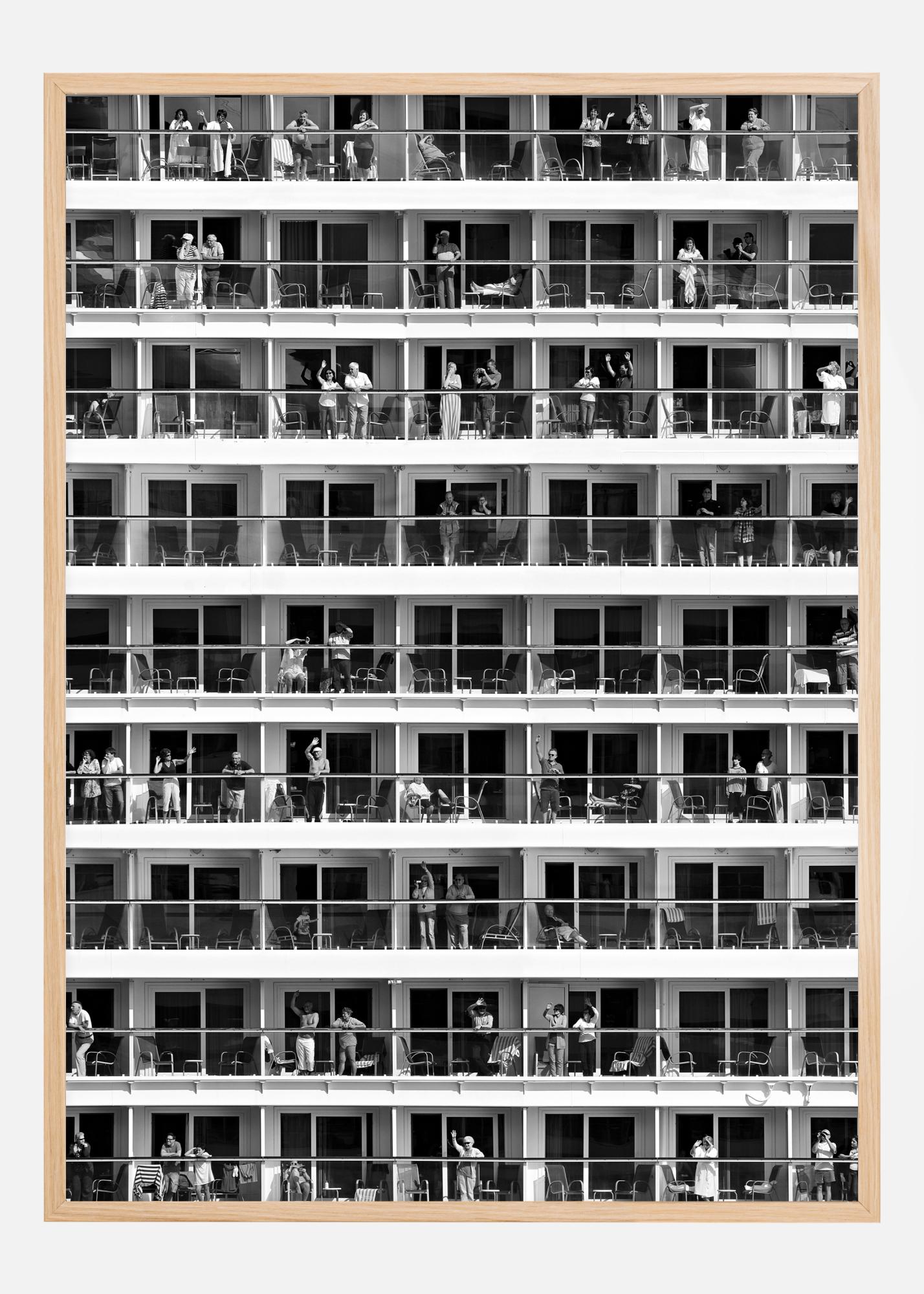 Geometrický cestovný plagát s radmi balkónov a ľuďmi, ktorí si užívajú slnko. Cíťte lásku, keď mávate späť na všetky priateľské tváre na tomto fantazijnom turistickom obrázku.