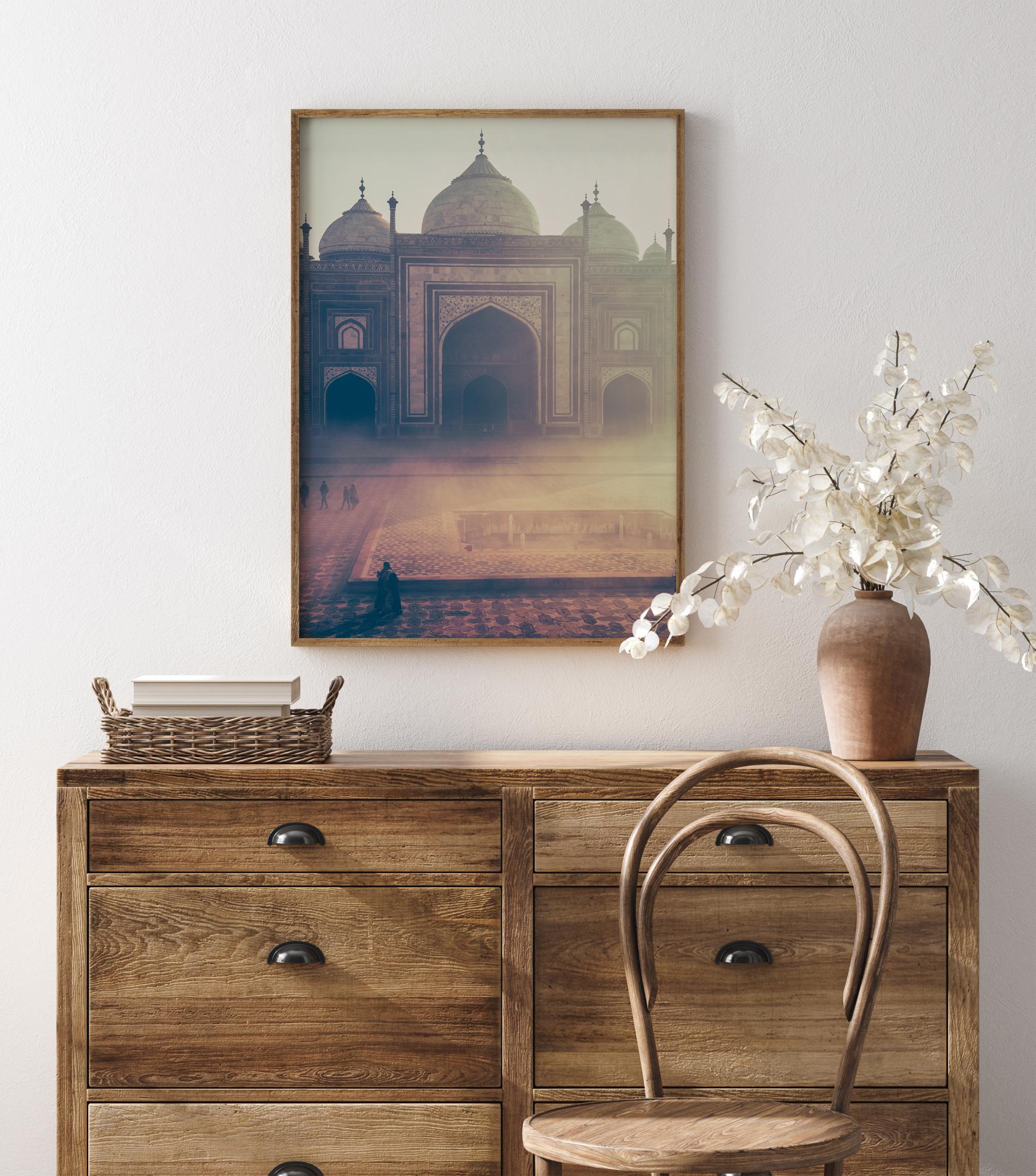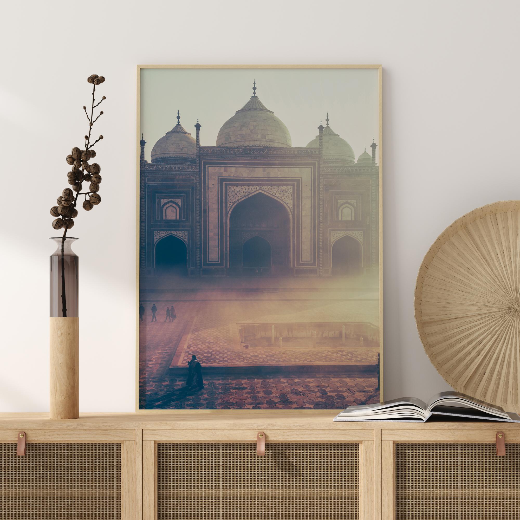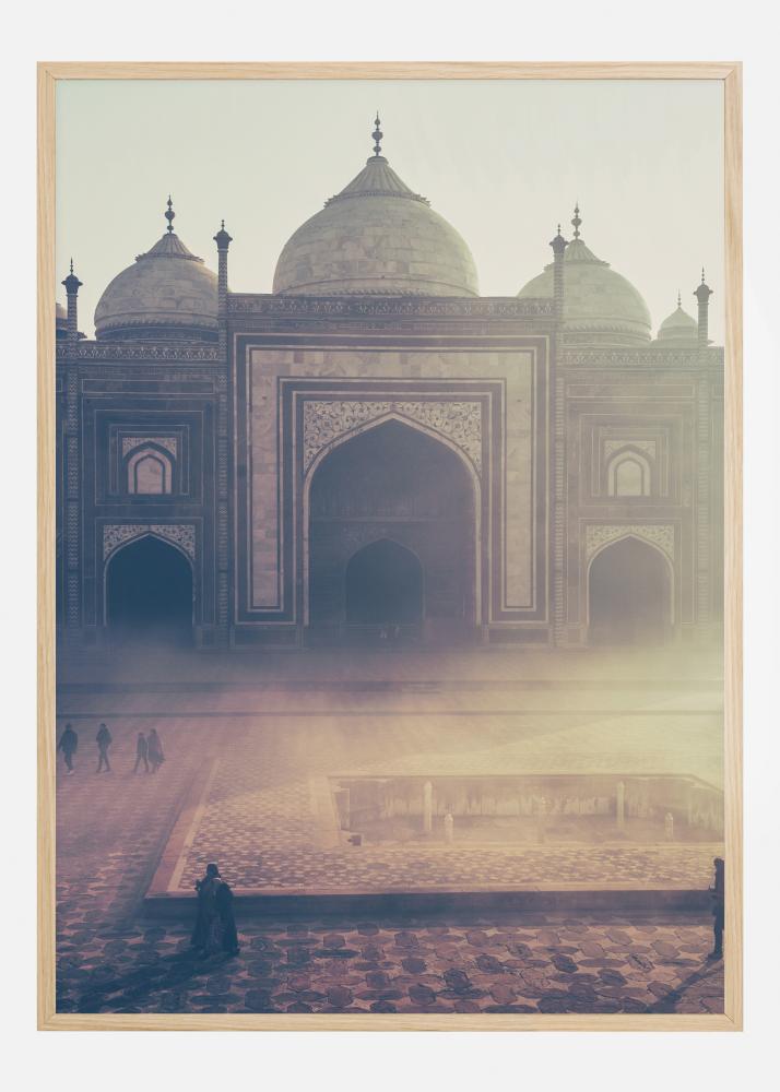 Duchovné centrum moslimského sveta stojí sebavedomo na námestí v popredí. Malá skupinka ľudí sa prechádza po námestí cez silno osvetlenú pretrvávajúcu hmlu. Najväčší z vchodov do mešity je lemovaný menšími vchodmi naľavo aj napravo. Pokojný plagát na vytvorenie upokojujúcej atmosféry.