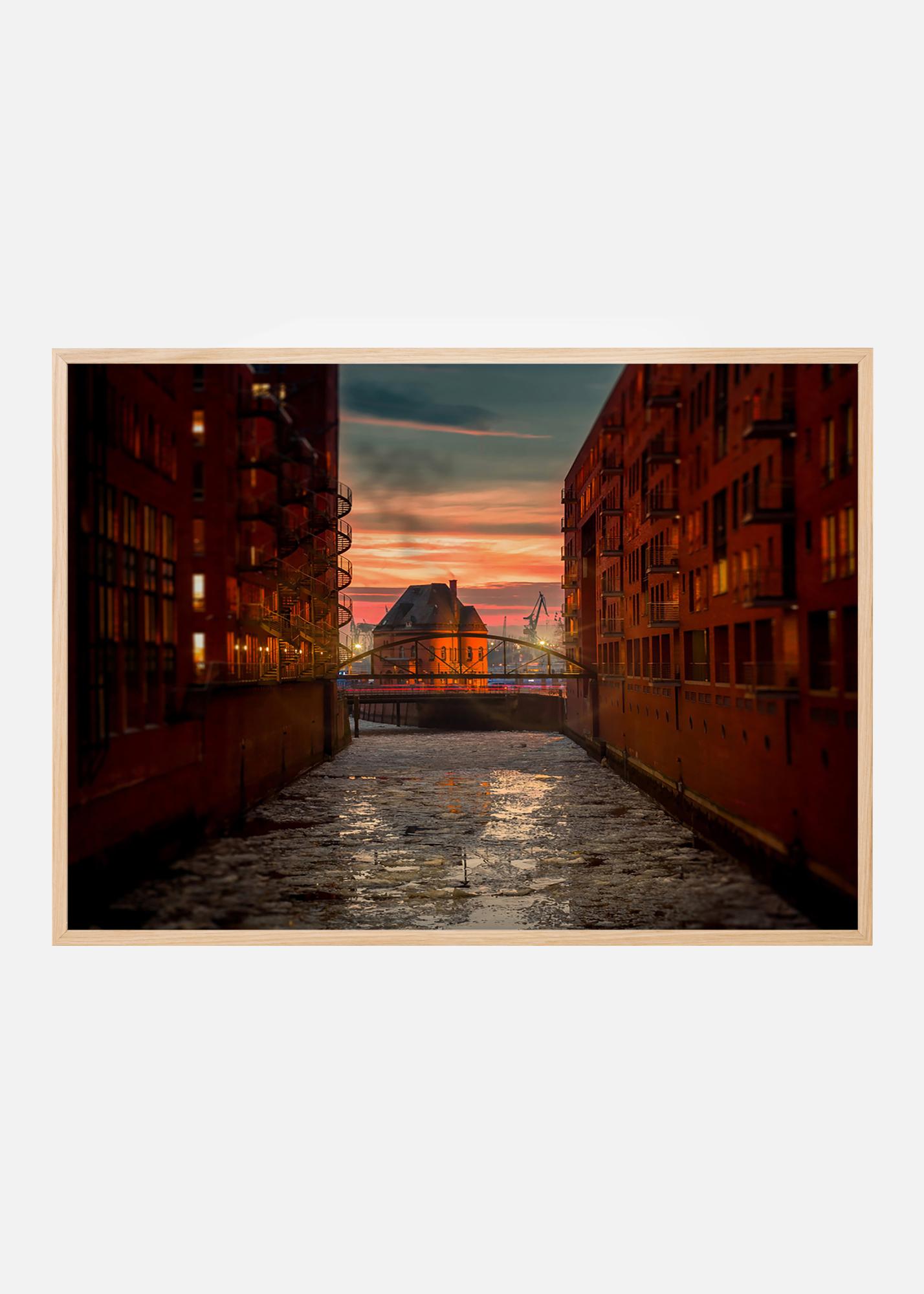 Západ slnka nad starou skladovou štvrťou Speicherstadt v Hamburgu s jej kanálmi a neogotickými tehlovými budovami. Fotografia zo chráneného územia kultúrneho dedičstva sa krásne hodí do domova osoby zaujímajúcej sa o architektúru alebo históriu. Plagát najlepšie vynikne v tenkom kovovom ráme, ktorý ladí so striktnou architektúrou a vyzerá pekne na stene spoločne s inými mestskými fotografiami.