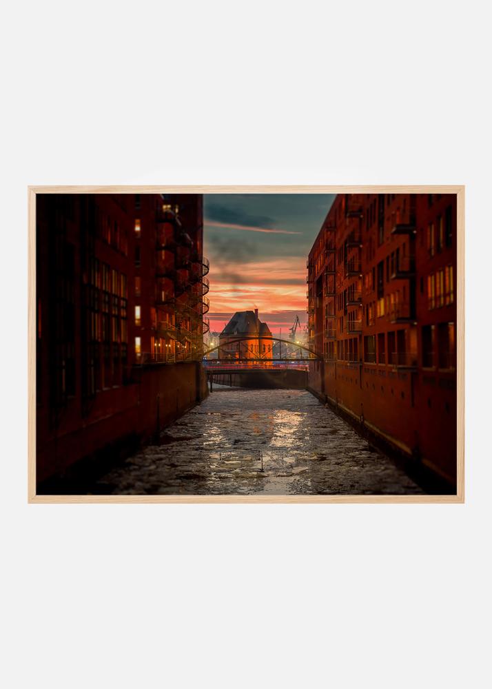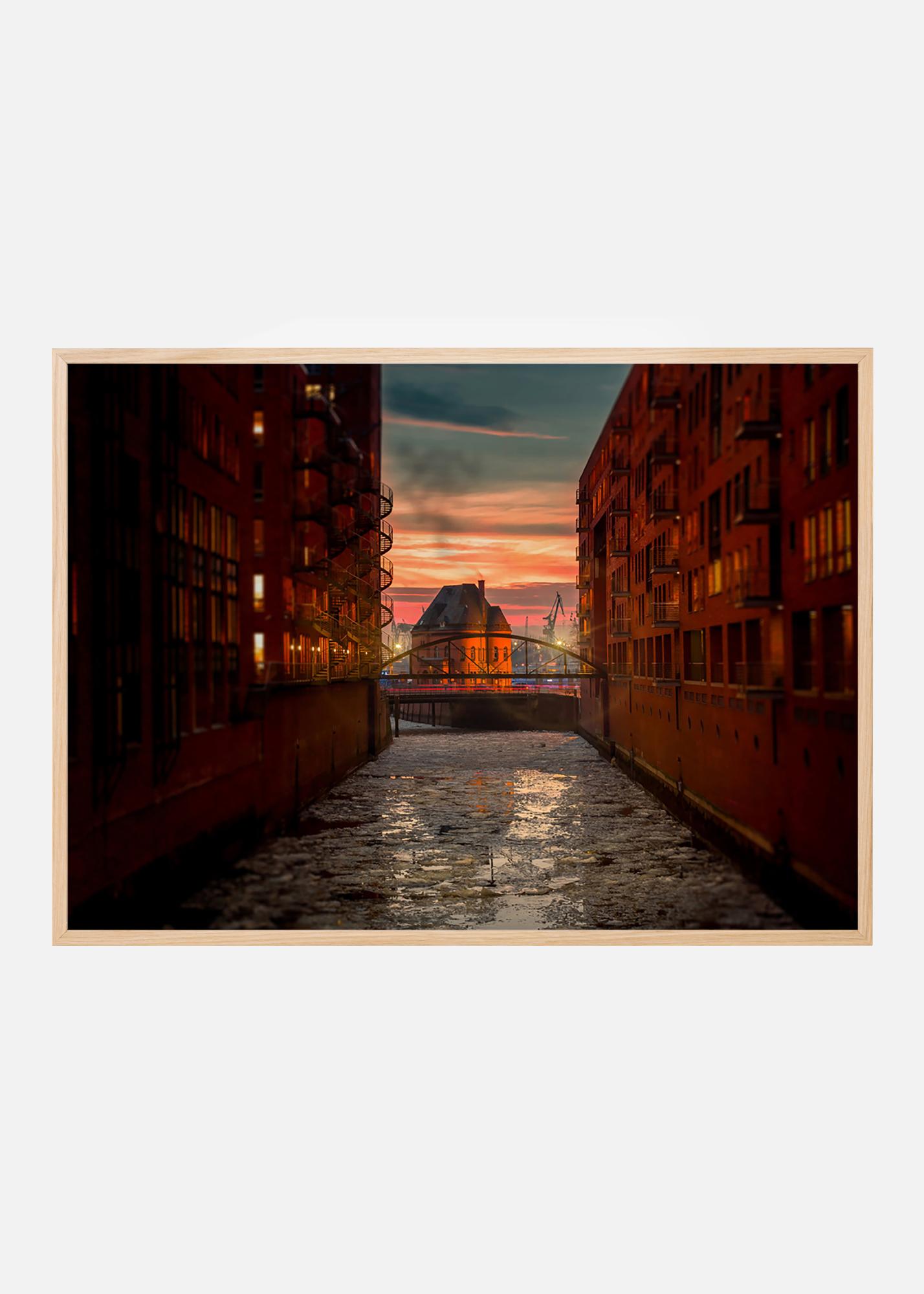 Západ slnka nad starou skladovou štvrťou Speicherstadt v Hamburgu s jeho kanálmi a novogotickými tehlovými budovami. Fotografia z oblasti chráneného kultúrneho dedičstva sa skvele hodí do domova pre milovníkov architektúry alebo histórie. Plagát sa najlepšie vyníma v tenkom kovovom ráme, ktorý ladí s prísnou architektúrou a vyzerá pekne na stene spolu s inými mestskými obrazmi.