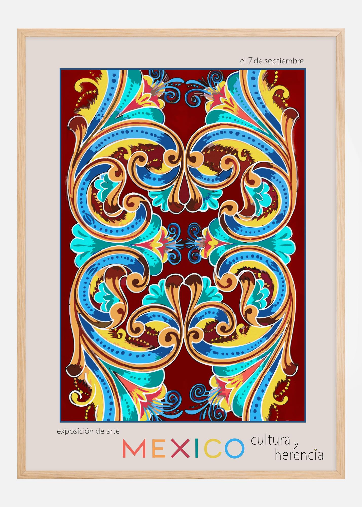 Táto živá a farebná plagát oslavuje umeleckú výstavu v Mexiku. Jej dizajn je inšpirovaný tradičnými mexickými vzormi, plný kľukatiacich sa kriviek a bujných kvetinových motívov, ktoré pozývajú oči tancovať po obraze. Bohaté červené, žlté a modré farby sú typické pre mexické ľudové umenie a symbolizujú kultúru a dedičstvo národa s moderným nádychom.