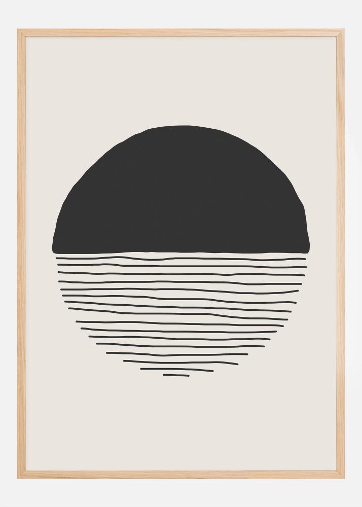 Tento plagát je poctou čistote a sile minimalistického dizajnu. Na motíve vidíme polkruh v hlbokej čiernej farbe, ktorý akoby levitoval nad sériou horizontálnych čiar v rovnakej tmavej farbe. Tento jednoduchý, ale odvážny kontrast oproti krémovému pozadiu vytvára silný vizuálny efekt. Je ideálny na vytvorenie moderného a sofistikovaného dojmu v priestore, ktorý si cení prísny dizajn a silné, grafické prvky.