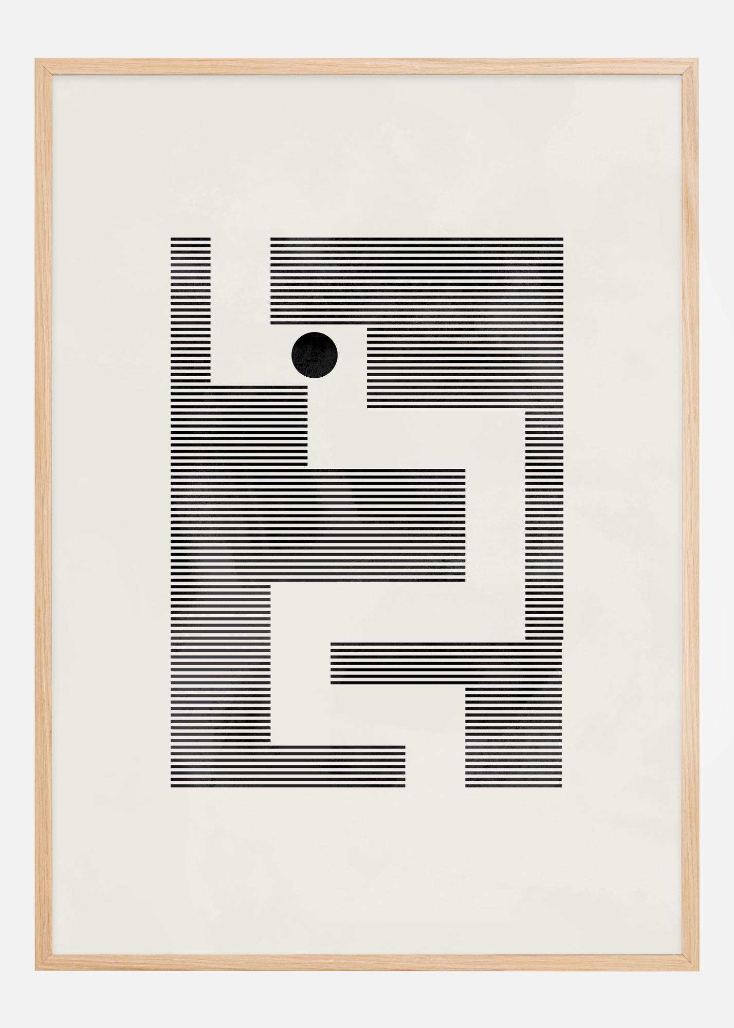 Táto umelecká plagát ponúka minimalistickú interpretáciu bludiska, vykonaná s čiernymi čiarami, ktoré tvoria zložitú sieť geometrických tvarov na smotanovom pozadí. Osamelý čierny kruh umiestnený v strede bludiska slúži ako vizuálny kotviaci bod, pričom dodáva hĺbku a zameranie inak jednoduchému motívu. Tento dizajn sa hrá s pozorovateľovým okom a povzbudzuje k vizuálnemu skúmaniu jeho ciest a slepých uličiek.