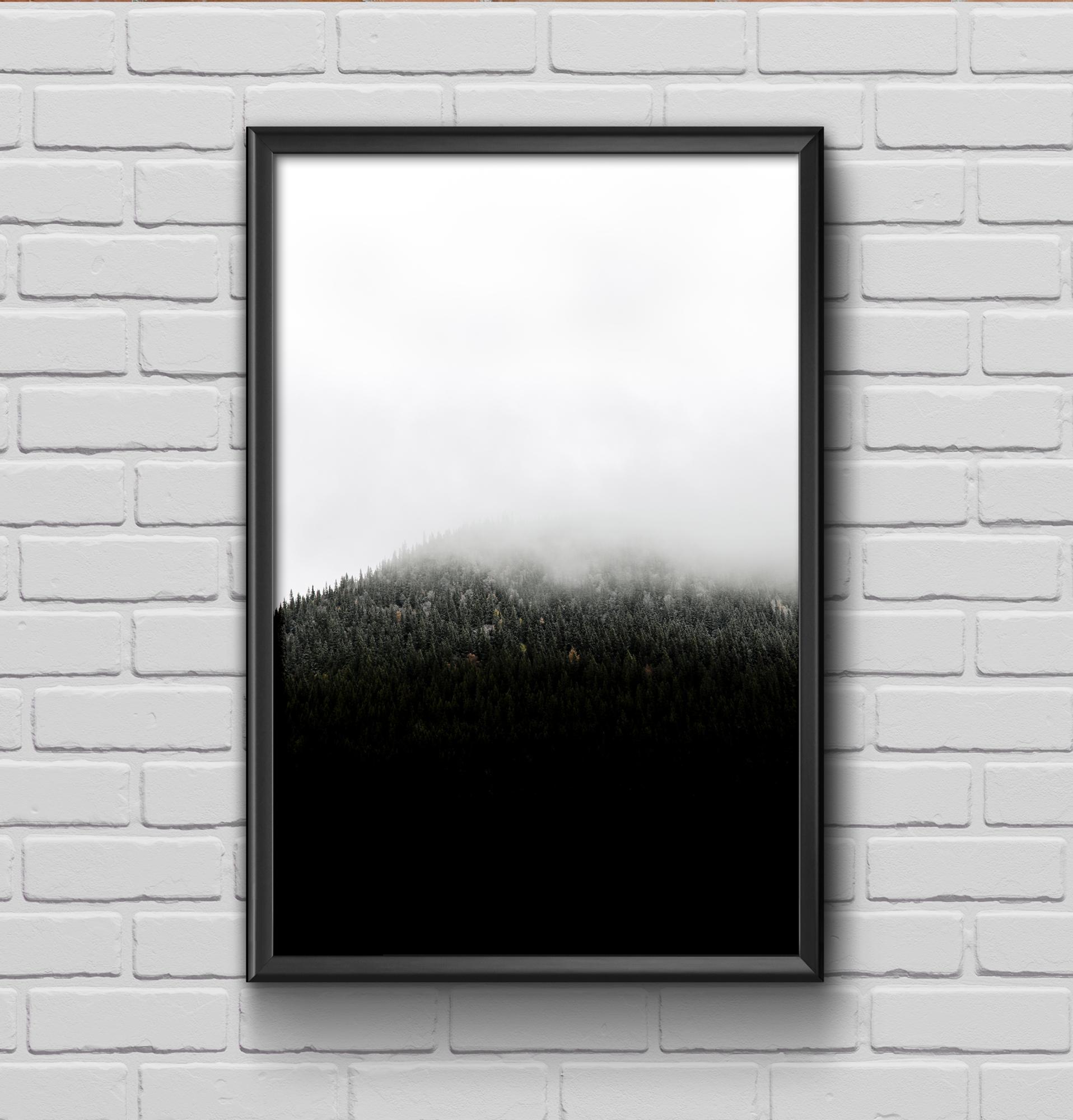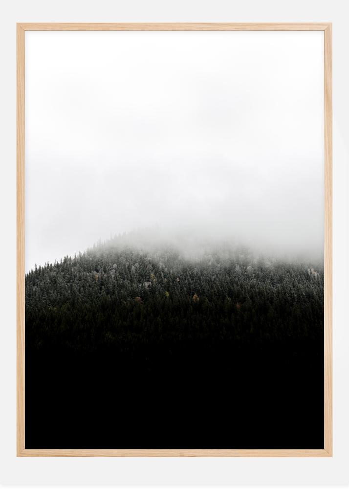 Pokojná prírodná fotografia lesom pokrytého vrcholu hory, ktorý spočíva pod hustou hmlou. Pokojný a harmonický plagát s ostrými kontrastmi a jemnými líniami. Skombinujte ho s viacerými našimi fantastickými motívmi na väčšej stene s obrazmi.