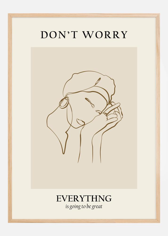 Táto umelecká fotografia zachytáva tichú chvíľu reflexie a vnútorného pokoja prostredníctvom línie kresby osoby, ktorá si drží ruku na tvári. Text "DON'T WORRY" veľkými písmenami prevyšuje obrázok a poskytuje upokojujúcu pripomienku, zatiaľ čo "EVERYTHING is going to be great" zdôrazňuje posolstvo s premyslenejším tónom. Toto moderné umelecké dielo je ideálne na vytvorenie pocitu pokoja a optimizmu doma alebo v kancelárii.