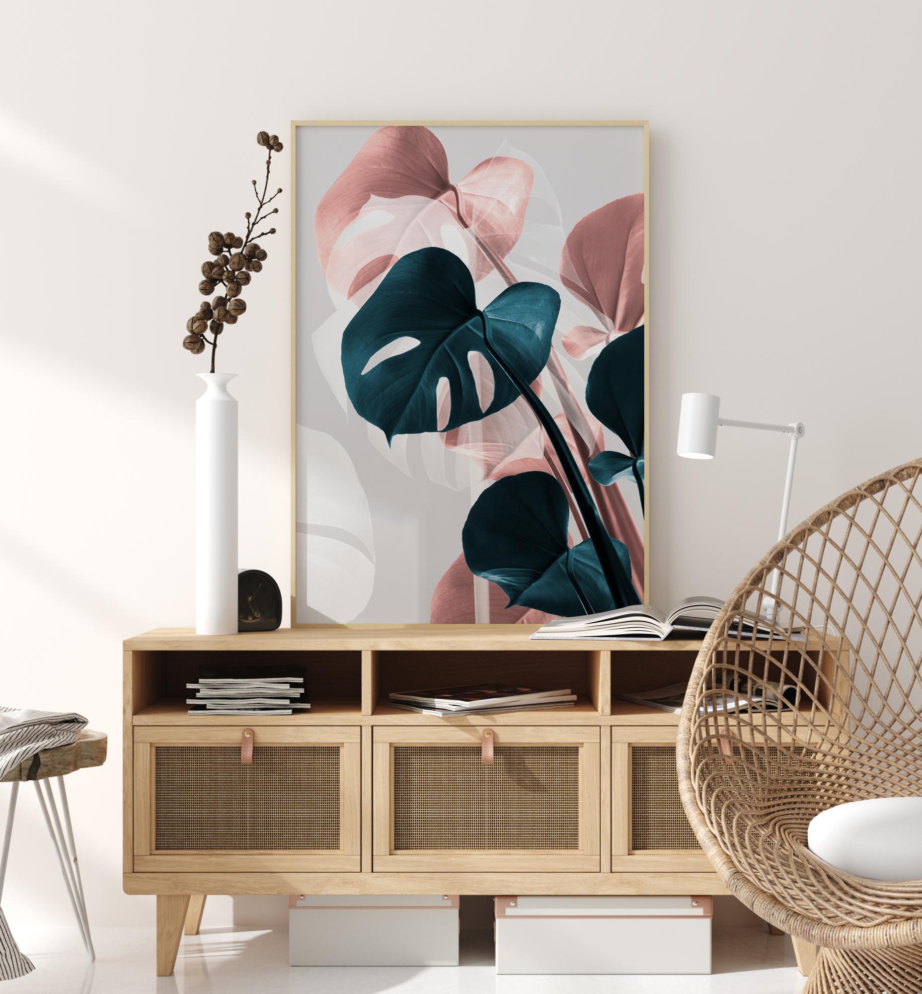 Krásny plagát s ružovými a tmavozelenými listami monstery, ktorý ukazuje dokonalú kreativitu v listoch. Na béžovom pozadí žiaria srdcovité listy svojimi krásnymi zelenými a ružovými listami. Vzory v tvare listov pridávajú vášmu domovu vzrušujúci pocit.