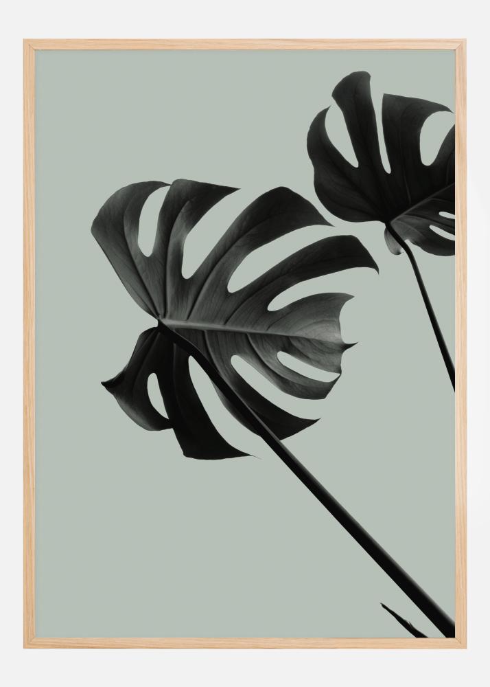 Čiernobiela detailná fotografia dvoch listov monstera. Srdcovité listy sú viditeľné proti matne šedému pozadiu a moment je zvýraznený svetlom za pierkovitými vzormi. Tento plagát je ideálny na to, aby priniesol vzrušujúci pocit týchto srdcovitých listov do vášho domova.