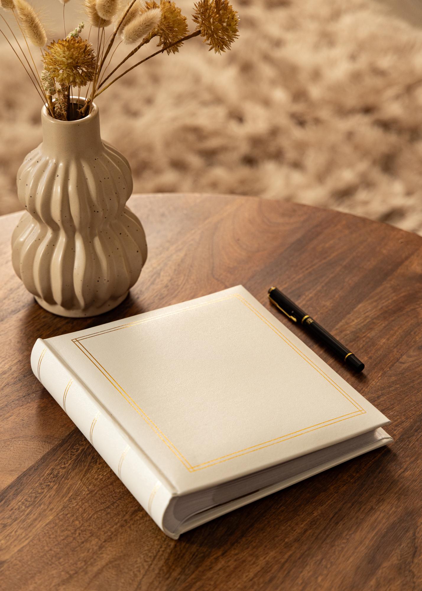 Uložte si svoje najkrajšie fotografie do klasického a elegantného fotoalbumu, ktoré má vkusne bielu farbu. Tento štvorcový album má pevnú a odolnú dosku s dvojitými zlatými líniami pozdĺž okrajov a na chrbte. Vo vnútri nájdete vrecká pre fotografie s kapacitou 200 obrázkov s rozmermi 10x15 cm. Pri každom vrecku sú linajkové polia na písanie. Elegantný a praktický spôsob, ako usporiadať svoje spomienky!